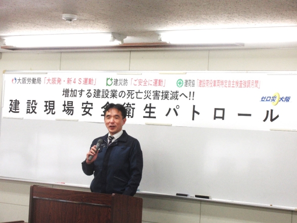 増加する建設業の死亡災害を撲滅するため、大阪労働局は、建設業労働災害防止協会大阪府支部、および建設荷役車両安全技術協会と合同で「建設現場安全衛生パトロール」を実施しました。府内の全監督署(13署)管内の建設現場13箇所を対象に、集中的な安全点検を行いました。