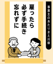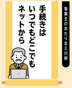 労働保険の手続は、電子申請により行うことができます。 電子申請での手続をご利用いただくと、行政機関に出向くことなく、自宅やオフィスでいつでも申請等の手続を行うことができます。 ●詳細は、右の「あたりまえ川柳」をクリックしてください。 ![]() |