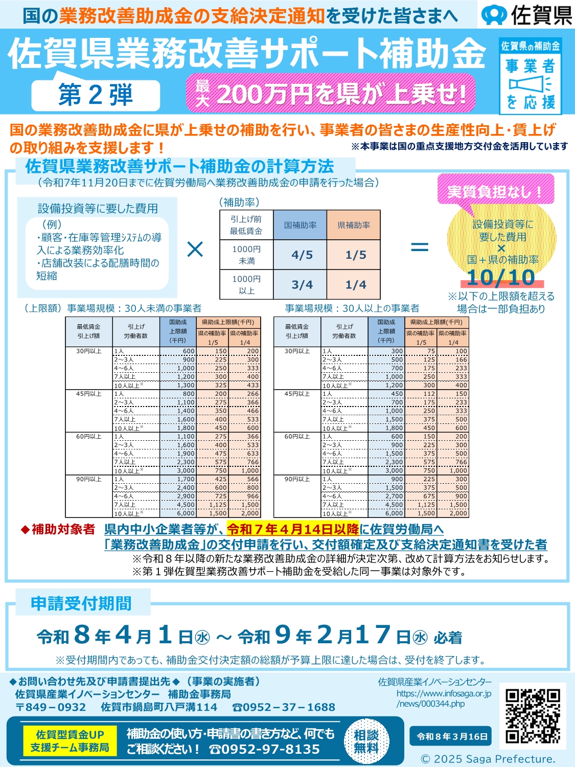 ※令和7年4月14日以降に佐賀労働局へ業務改善助成金の申請を行い、令和8年2月13日以降に交付額確定及び支給決定通知を受けた事業者も、「第2弾」佐賀県業務改善サポート補助金の補助対象者となります。