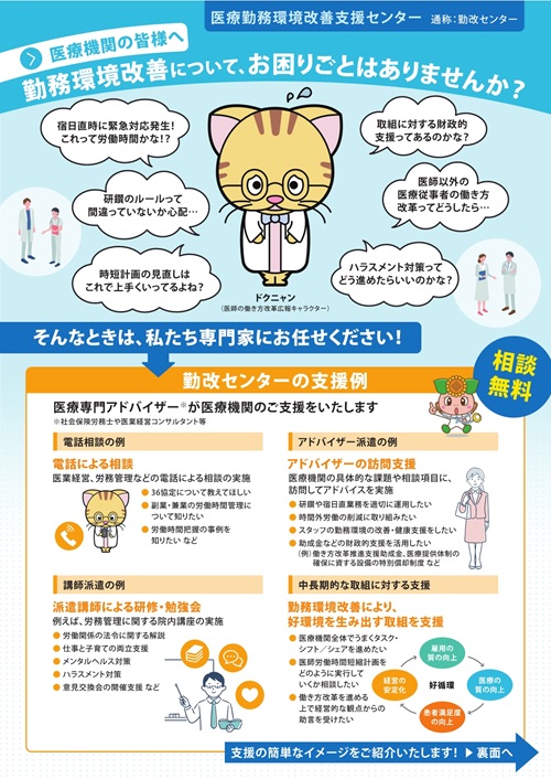 無料で利用でき、支援は、勤改センターに配置された医療労務管理アドバイザー(社会保険労務士)などの専門家が医療機関を直接訪問するなどの方法で行います。