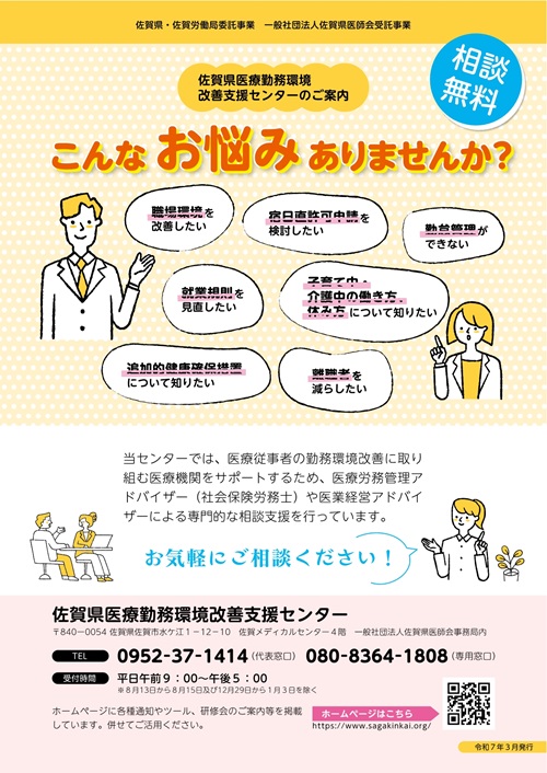 同センターは佐賀県医師会が運営するもので、佐賀労働局から「医療労務管理支援事業」を委託され、医療機関の勤務環境の改善を促進するために相談対応や支援を行っています。