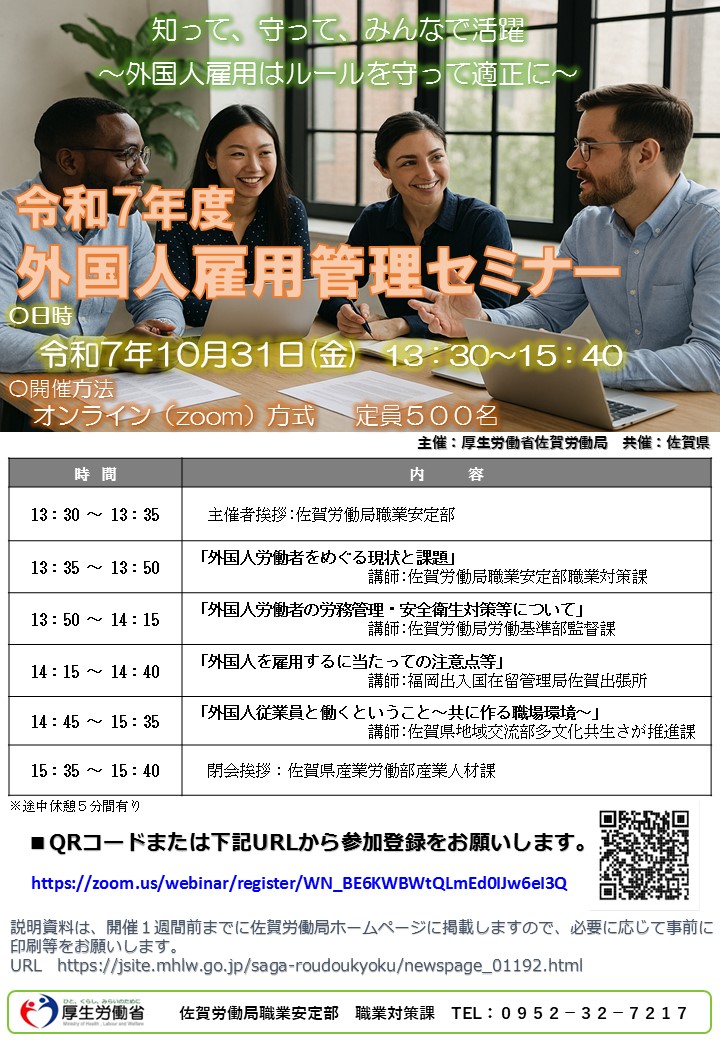 佐賀労働局では、外国人労働者の適切な雇用管理及び適正な労働条件の確保等を推進するため、下記のとおり外国人労働者を雇用する事業主、あるいはこれから雇用しようとする事業主等を対象としたセミナーを開催いたします。