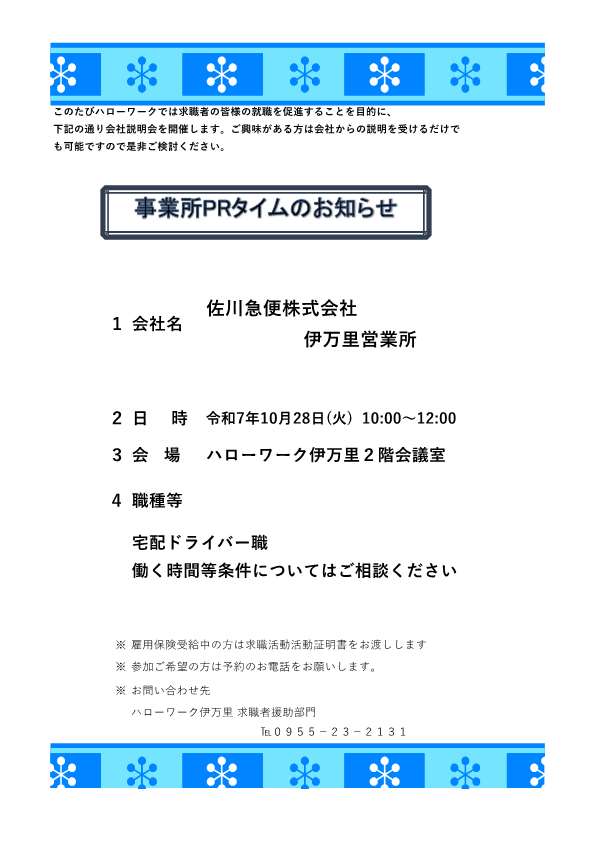 10月16日(木) ⇒ ハローワーク伊万里2階会議室