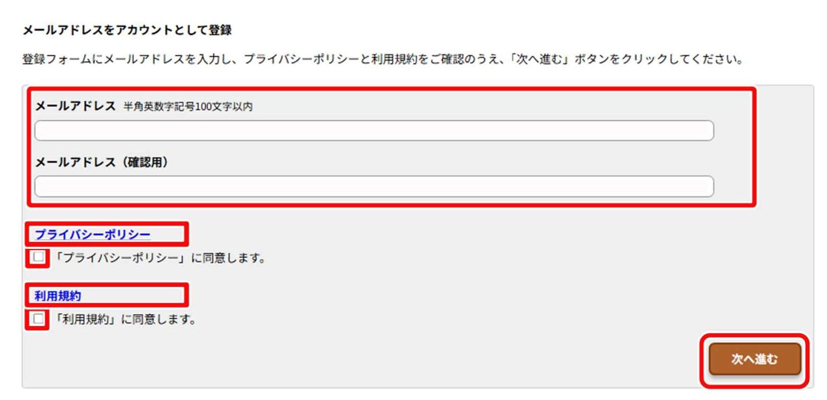 ●メールアドレスの入力、「プライバシーポリシー」および「マイページ利用規約」に同意後、次へ進みます。