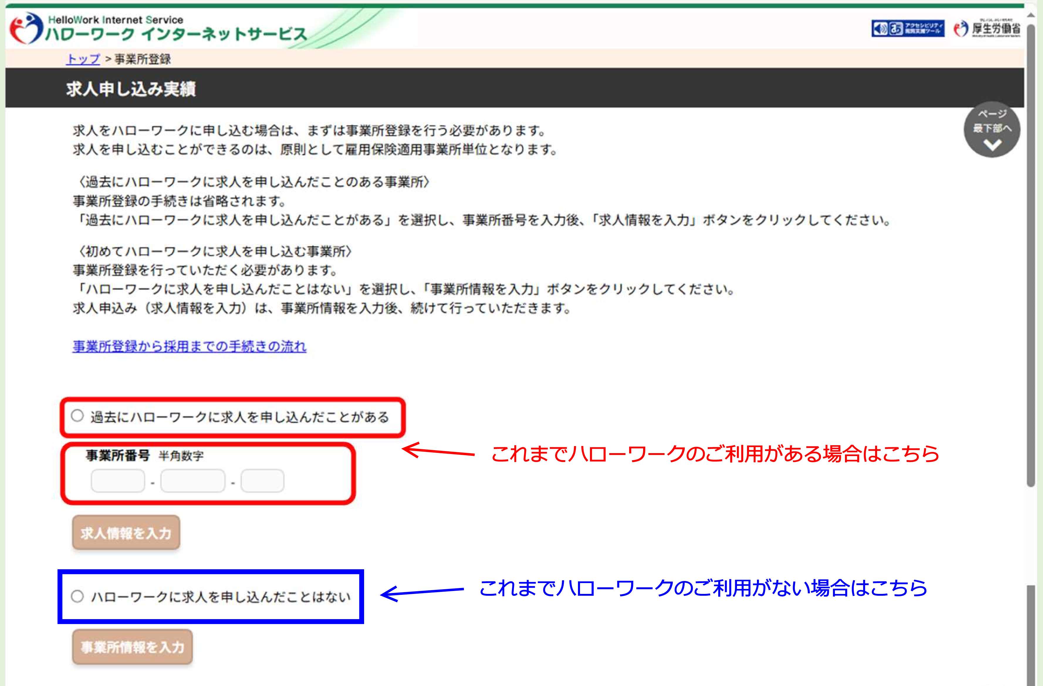 ご利用歴がある場合 ⇒ 事業所番号を入力のうえ「求人情報の仮登録」のみで手続き完了です。