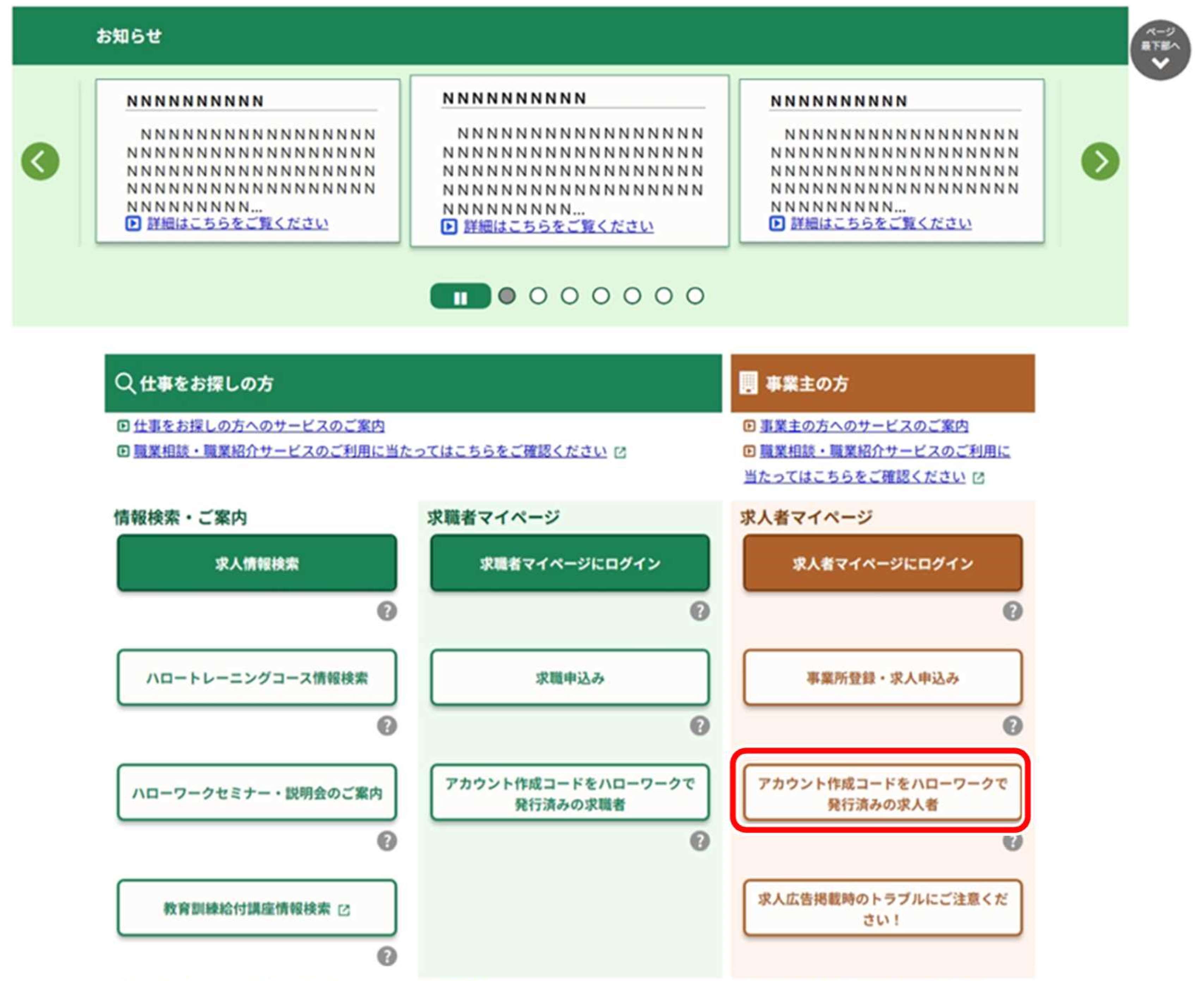 ●【アカウント作成コードをハローワークで発行済みの求人者】をクリック