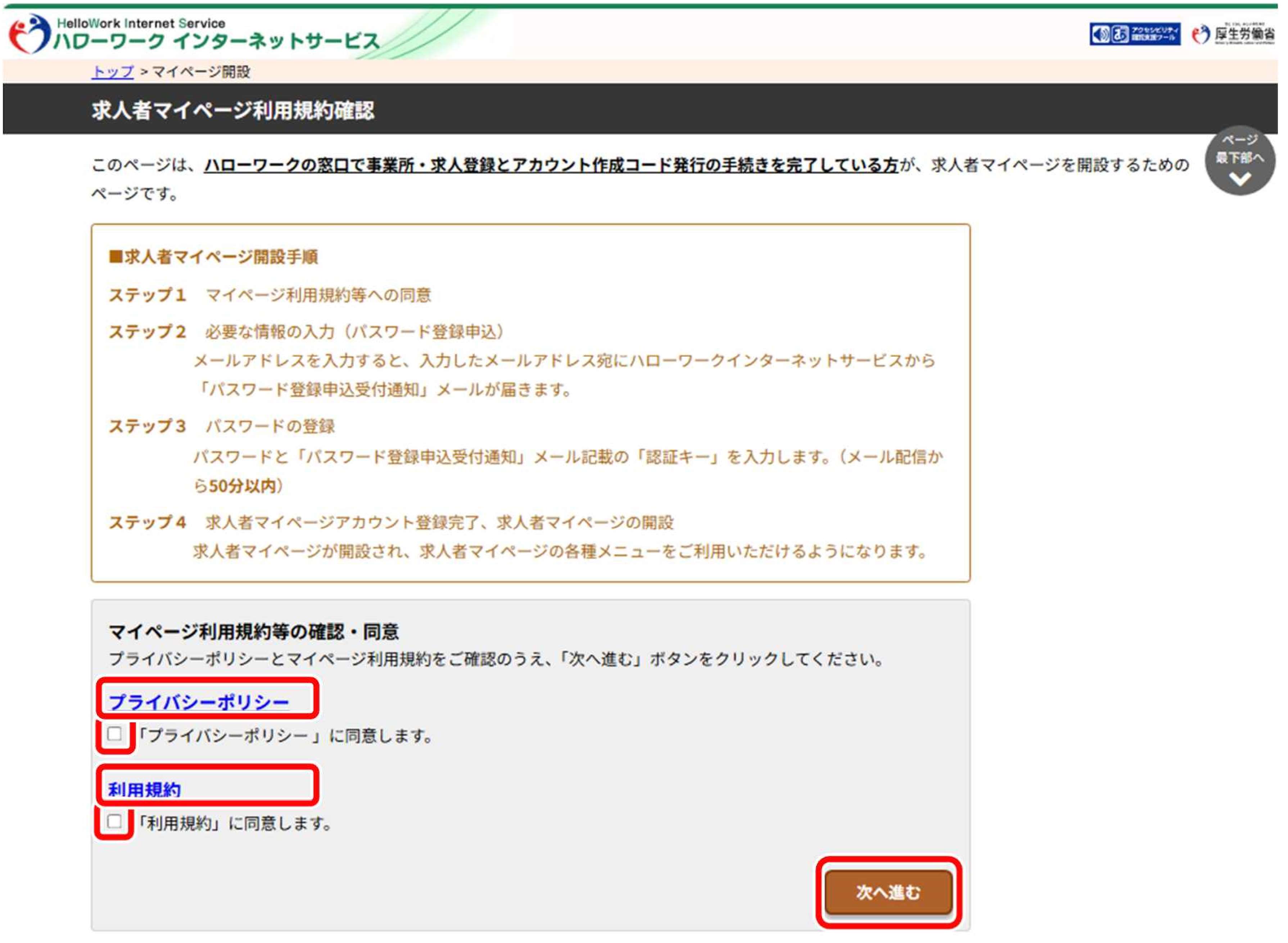 ●「プライバシーポリシー」および「利用規約」に同意後、次へ進みます。