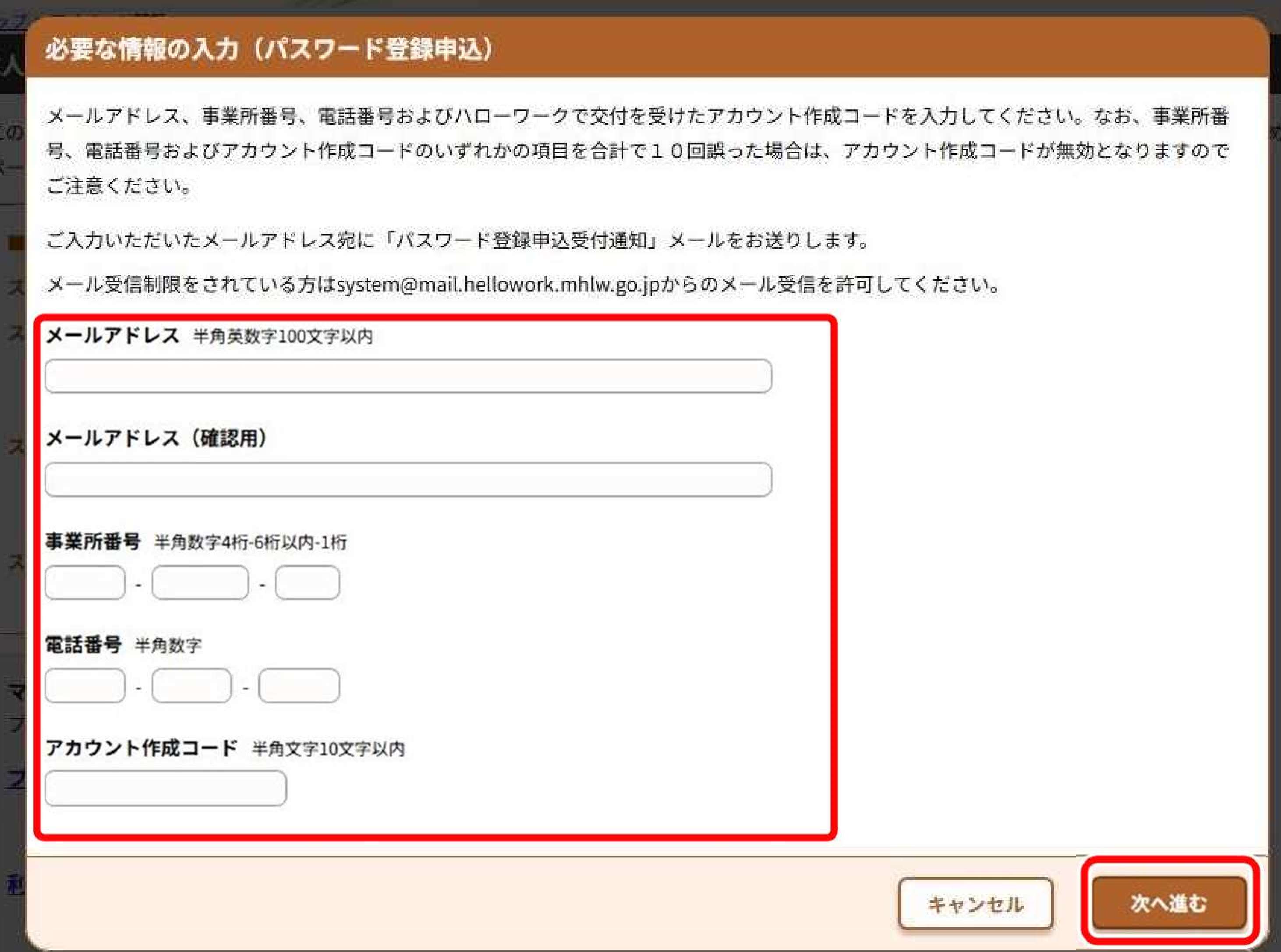 ●登録する「メールアドレス」、ハローワークへ登録の「事業所番号」「電話番号」、新たな「アカウント作成コード」を入力後、次へ進みます。
