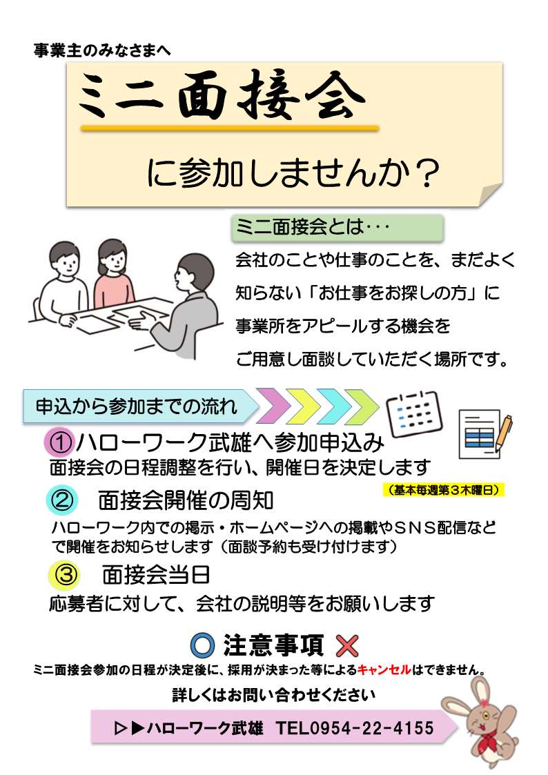ハローワーク武雄は定期的にミニ面接会を開催しております。奮ってご参加ください。