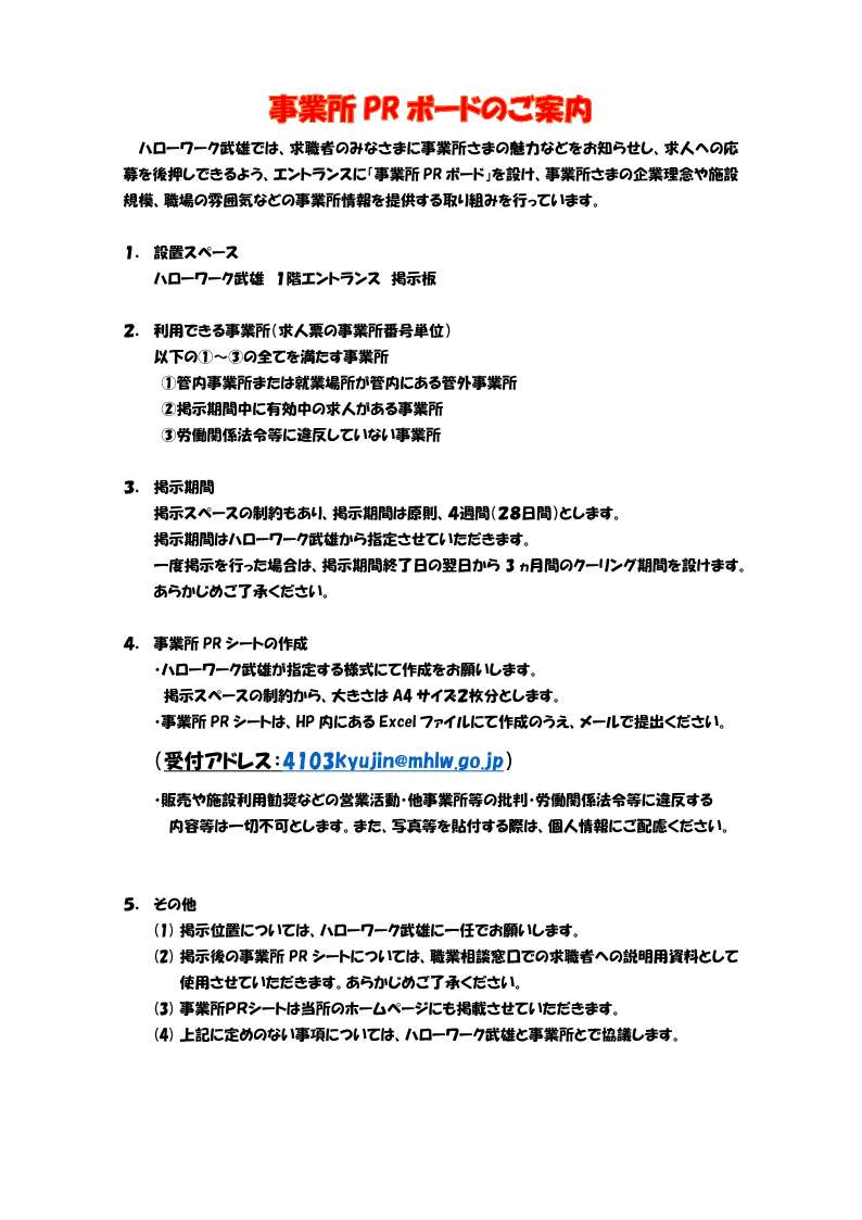 求人票では表せない良い点をPRしませんか? ハローワーク武雄では、入口ホールに設置している掲示板を利用して、来所者向けに事業所のPRが可能です。 ※さらに多くの方にPRできるよう、当所のホームページでも公開しています!→PRシートはコチラ ご利用希望の場合は、事前にハローワーク武雄の求人・事業所部門(0954-22-4155)までご連絡ください。 事業所PRシート様式は▶▷コチラ