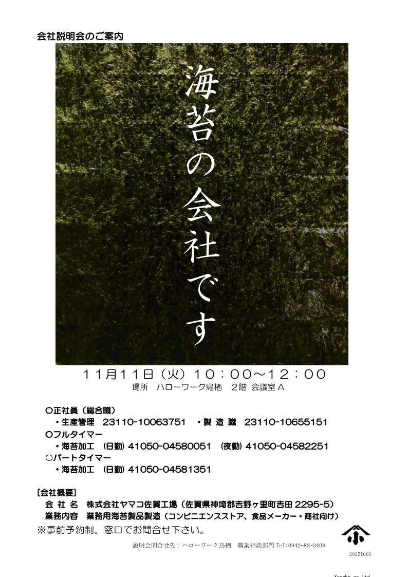 職種 :総合職(生産管理)、総合職(製造職)、海苔加工