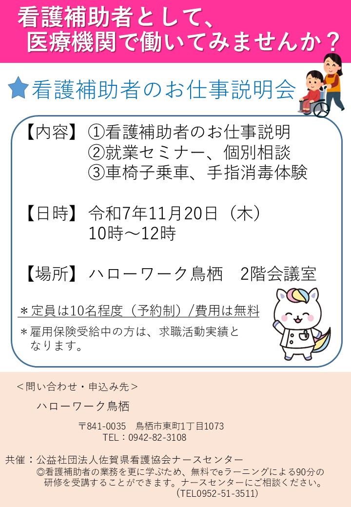 ハローワーク鳥栖では令和7年11月20日(木)に看護補助者のお仕事説明会を開催します。