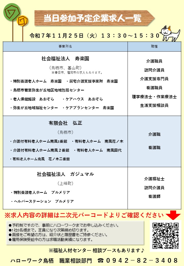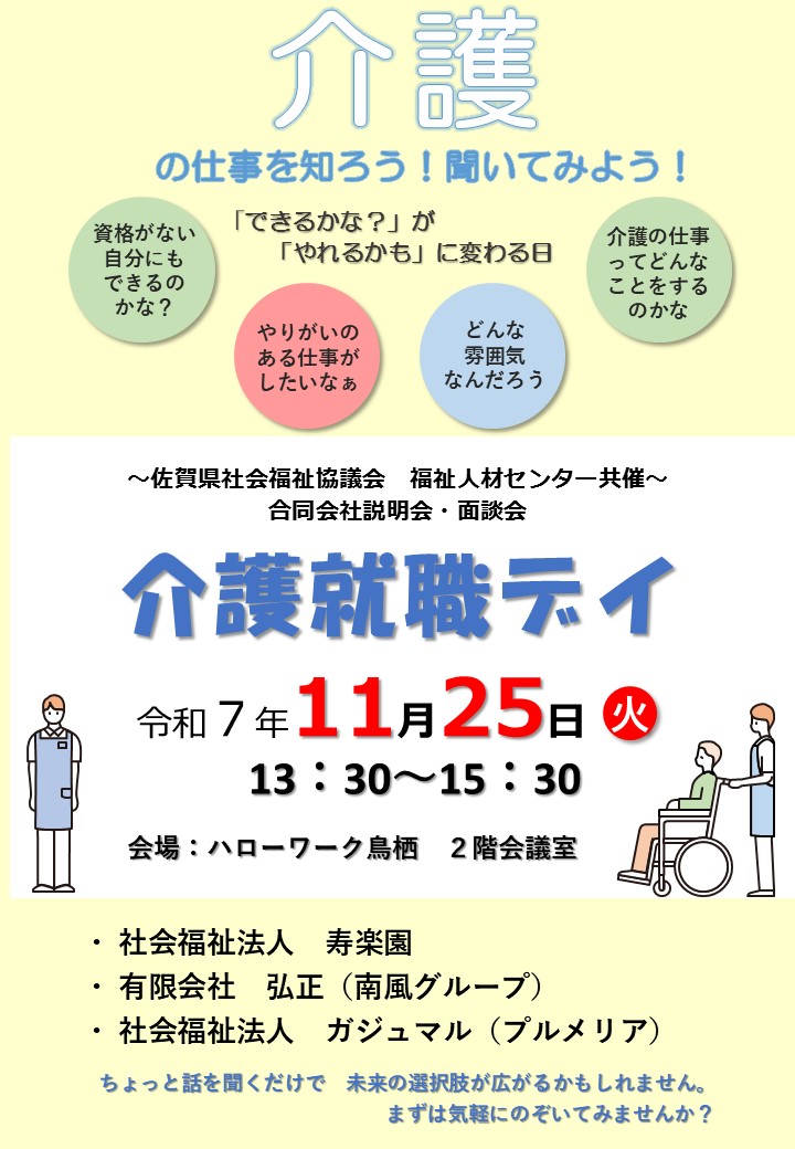 ●ハローワーク鳥栖では、11月の介護の日にちなみ、介護福祉のお仕事に興味がある方を対象に、介護就職デイとして合同会社説明会・面談会を開催します。