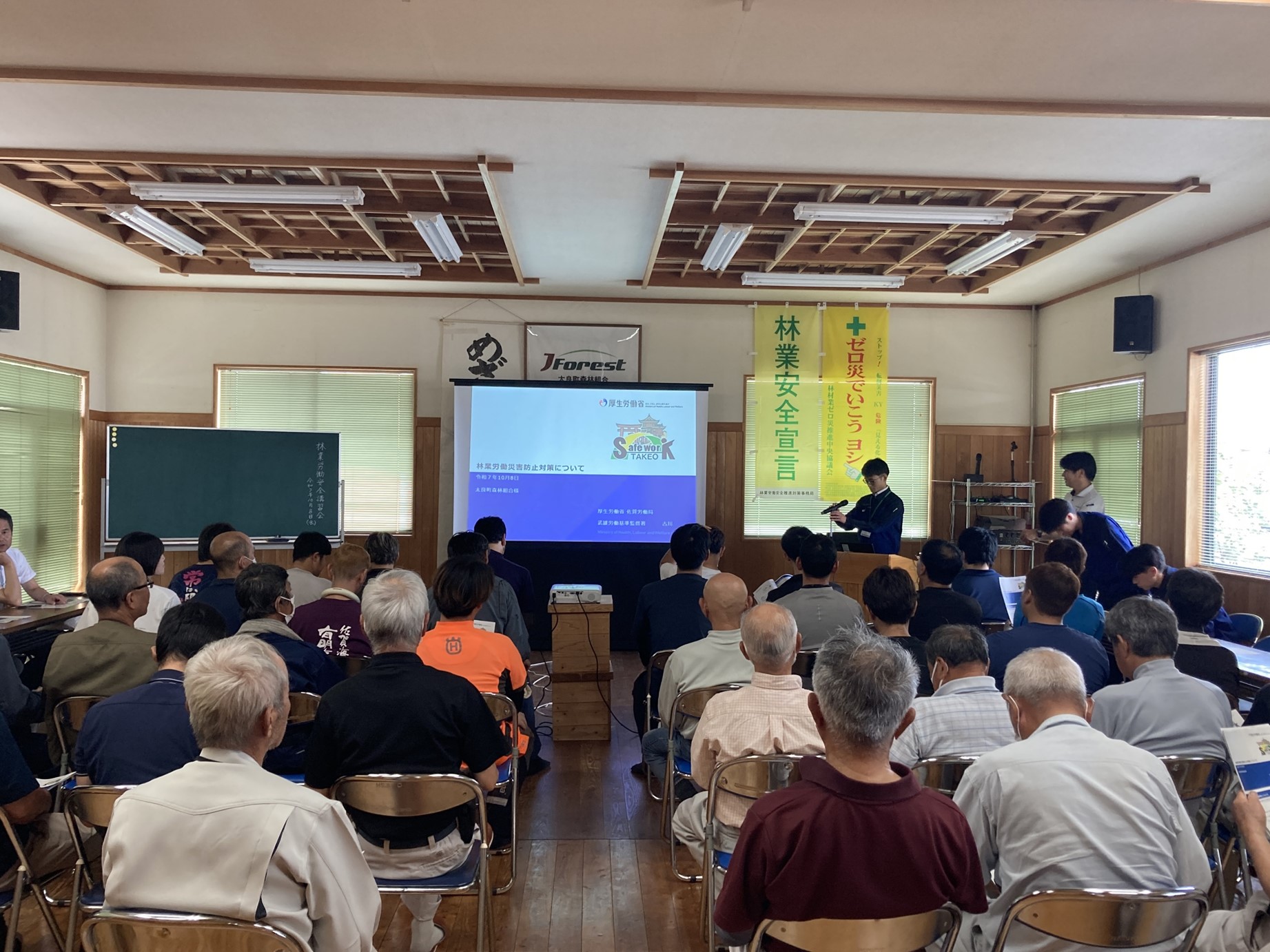 林業労働災害防止のため、太良町森林組合主催で林業従事者を対象とする講習会が開催され、武雄労働基準監督署から古川監督官が講師として、佐賀労働基準監督署及び伊万里労働基準監督署から任官1年目の労働基準監督官が研修として参加させていただきました。