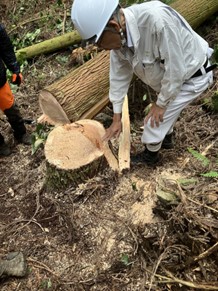 午後の実地講習の様子です。太良町森林組合の指導者が、受講者が伐倒した木の切り口を見て、改善点等を指導しています。伐倒の際は、受け口や追い口などを適切に作る必要があります。