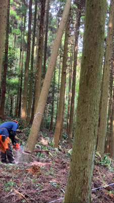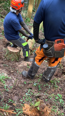午後の実地講習の様子です。チェーンソーによる伐木を行いましたが、かかり木が発生したため、フェリングレバーを用いて安全に倒れるよう処理を行っています。伐木作業やかかり木の処理は最も危険な作業の一つになりますので、退避場所の選定、合図、作業方法などについて労働安全衛生規則を遵守する必要があります。