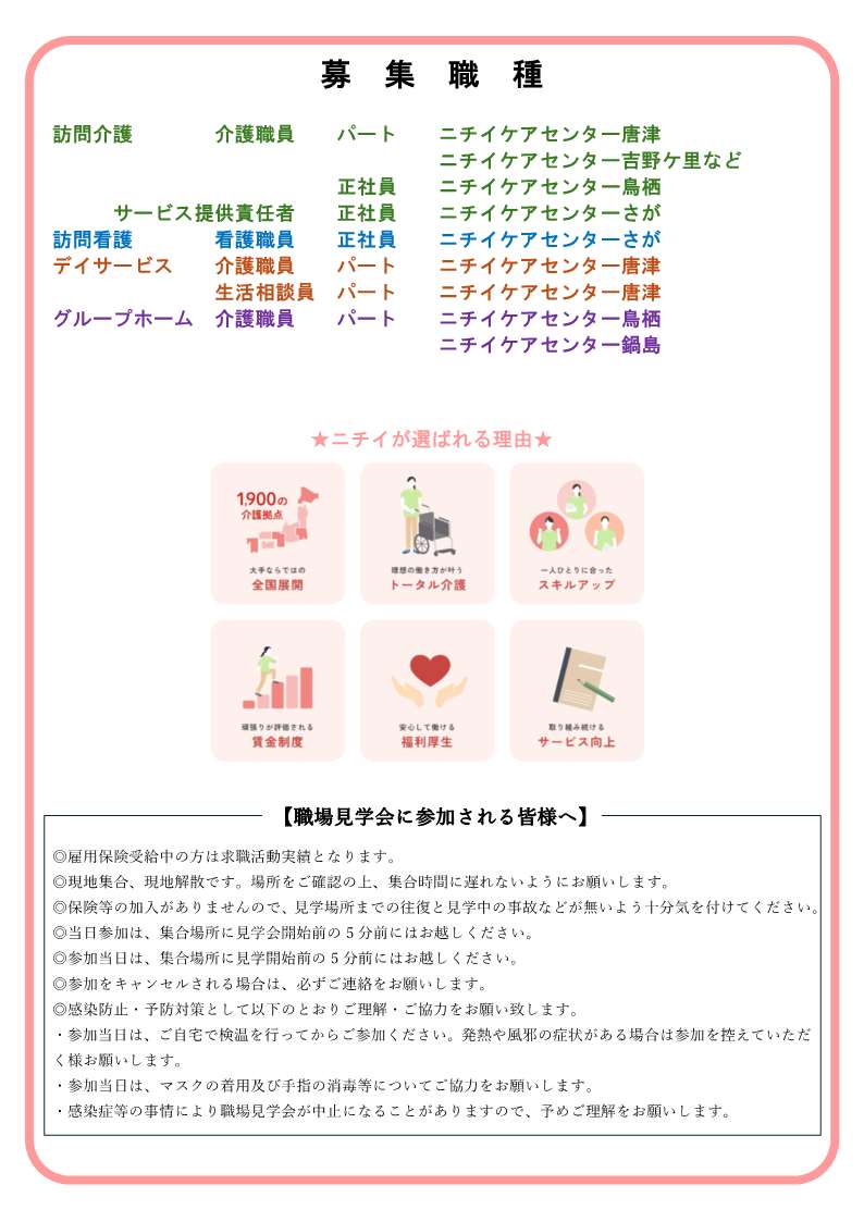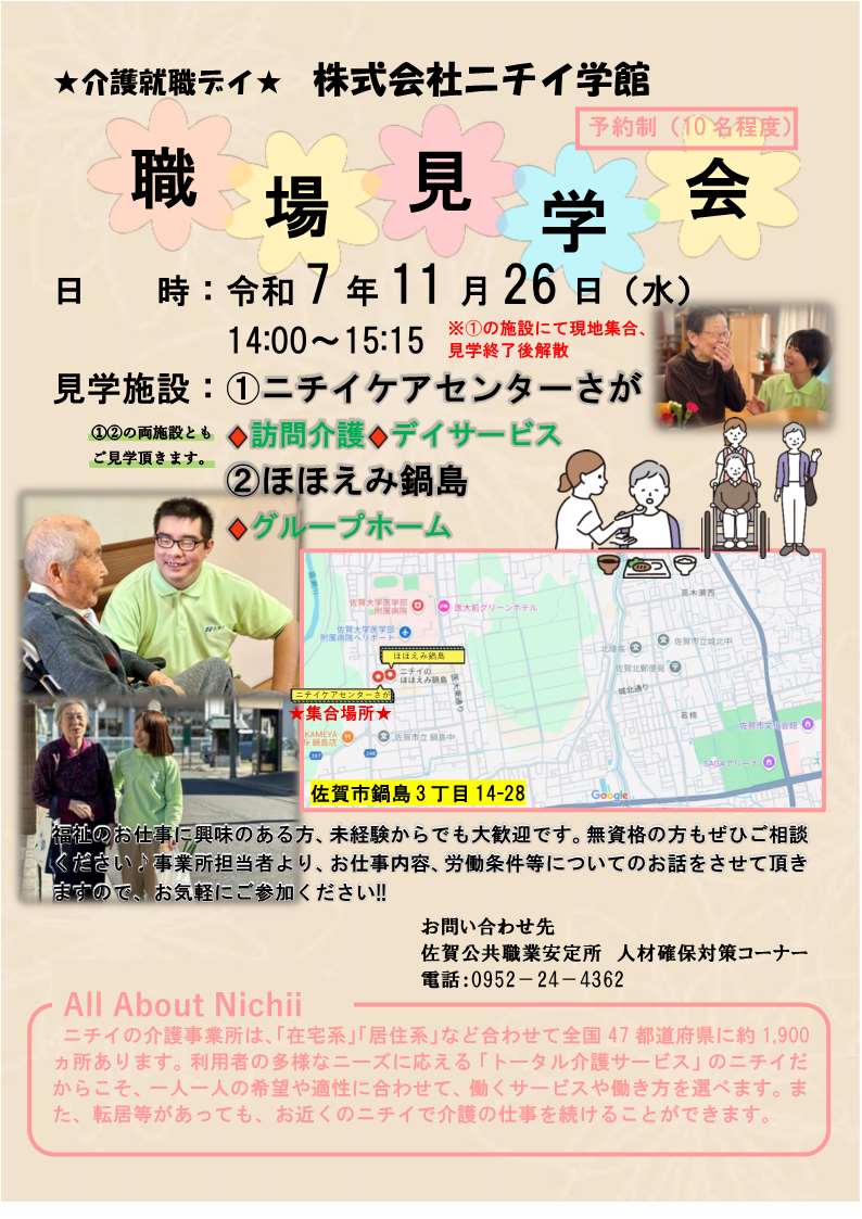 ハローワーク佐賀 職場見学会のお知らせ 日 時 : 令和7年11月26日(水)14:00~15:15 現地集合・解散 場 所 : 株式会社 ニチイ学館 ①ニチイケアセンターさが(佐賀市鍋島3丁目14-28) ・訪問介護 ・デイサービス ②ほほえみ鍋島 ・グループホーム ※①②の両施設ともご見学いただきます。まずは、①ニチイケアセンターさがにご集合下さい。