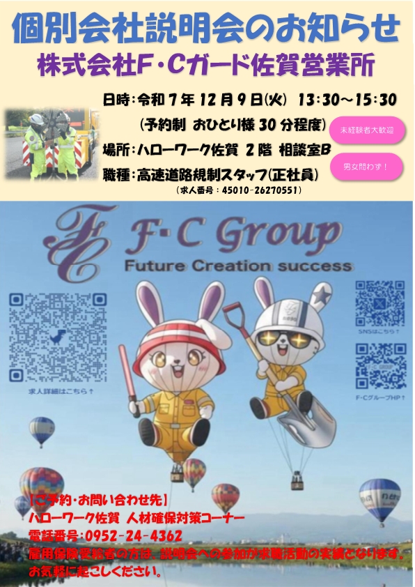 株式会社 F・Cガード佐賀営業所 日時:令和7年12月9日(火)13:30~15:30 場所:ハローワーク佐賀 2階 相談室B 募集職種:高速道路規制スタッフ(正社員) ◎チラシもご覧ください。チラシをクリック!