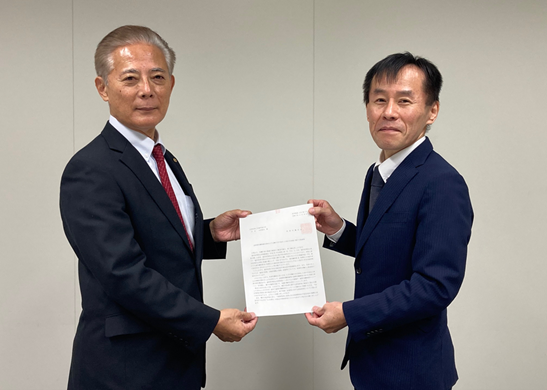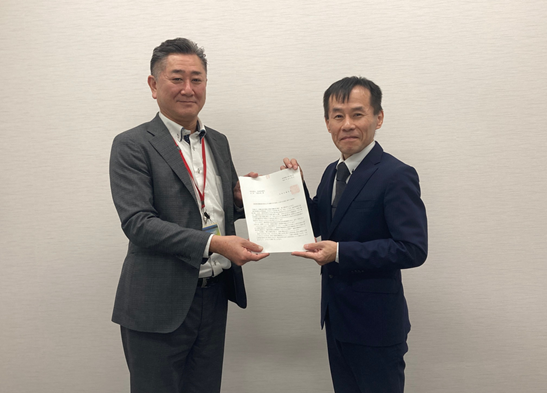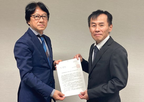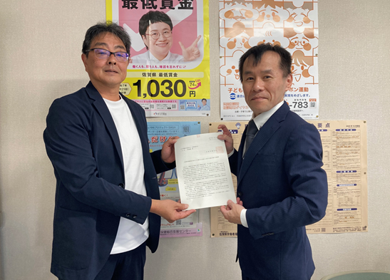 恒吉労働基準部長(右)が佐賀県社会保険労務士会徳富副会長(左)に要請書を手交している様子