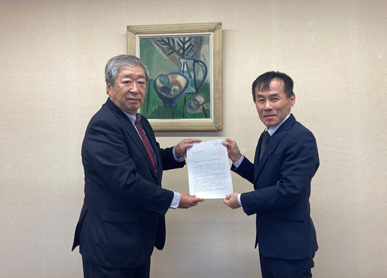 恒吉労働基準部長(右)が佐賀県商工会連合会今村専務理事(左)に要請書を手交している様子