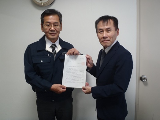 恒吉労働基準部長(右)が佐賀県トラック協会石橋専務理事(左)に要請書を手交している様子
