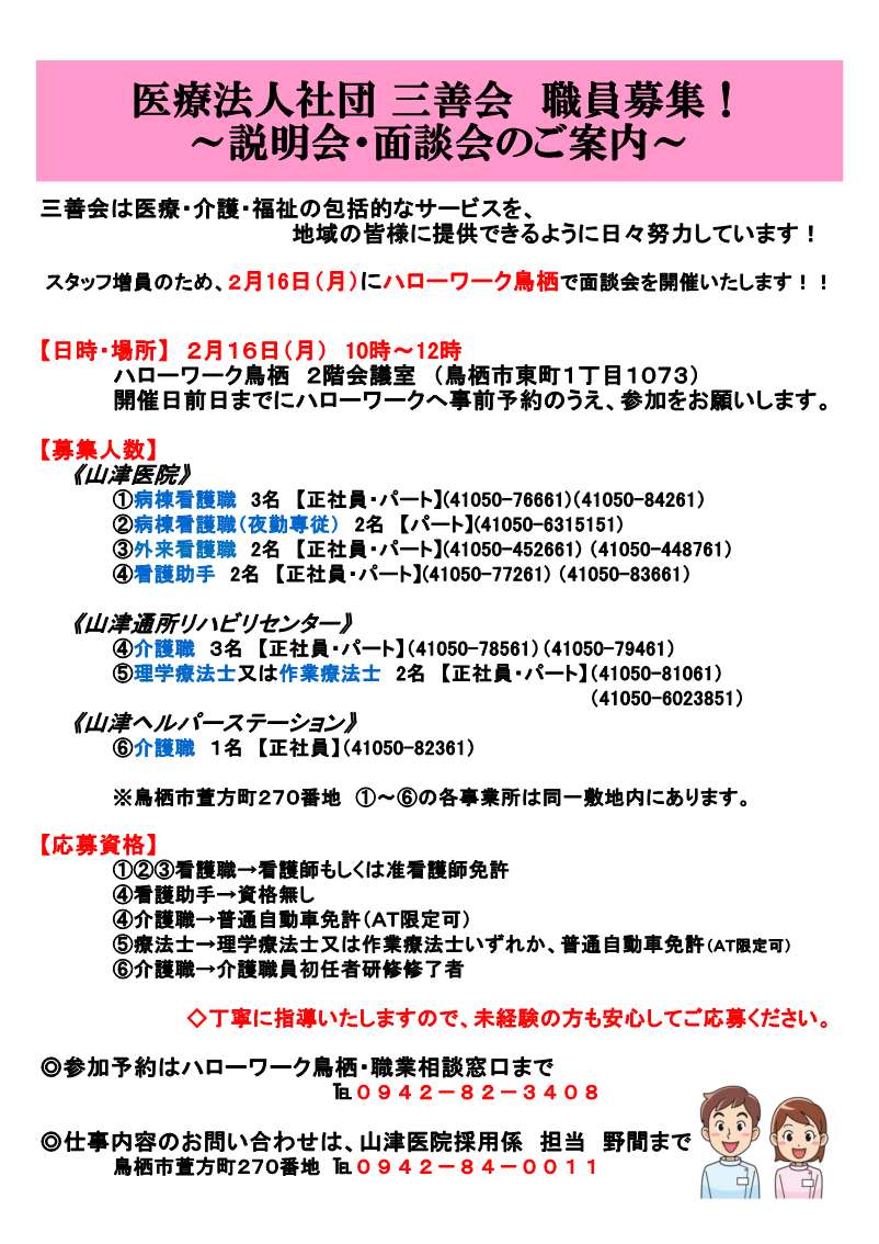 職種 :看護師(正・准)、看護助手、介護職、療法士