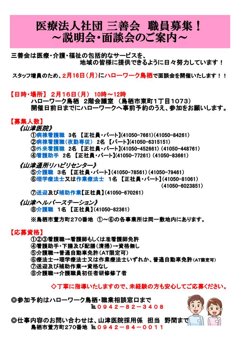 職種 :看護師(正・准)、看護助手、介護職、療法士、送迎及び補助作業