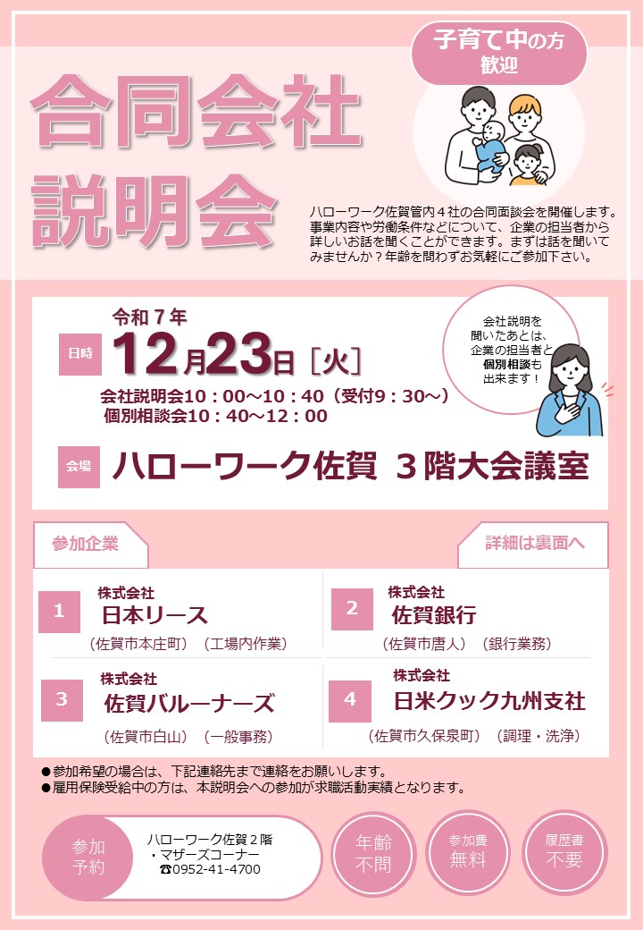 ハローワーク佐賀管内4社の子育て中の方歓迎の合同会社説明会を開催します。