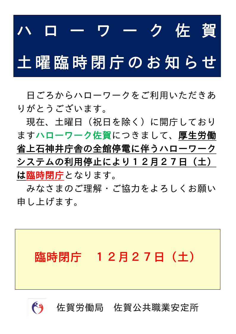 - ハローワーク佐賀 土曜臨時閉庁のお知らせ