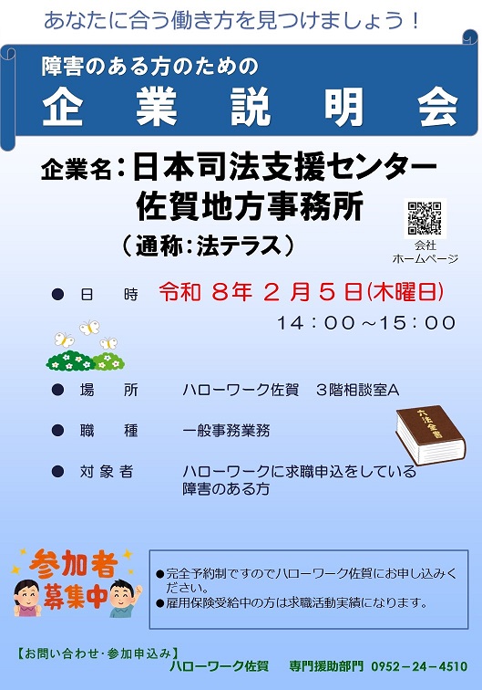 日本司法支援センター佐賀地方事務所の障害者のための個別会社説明会を開催します。