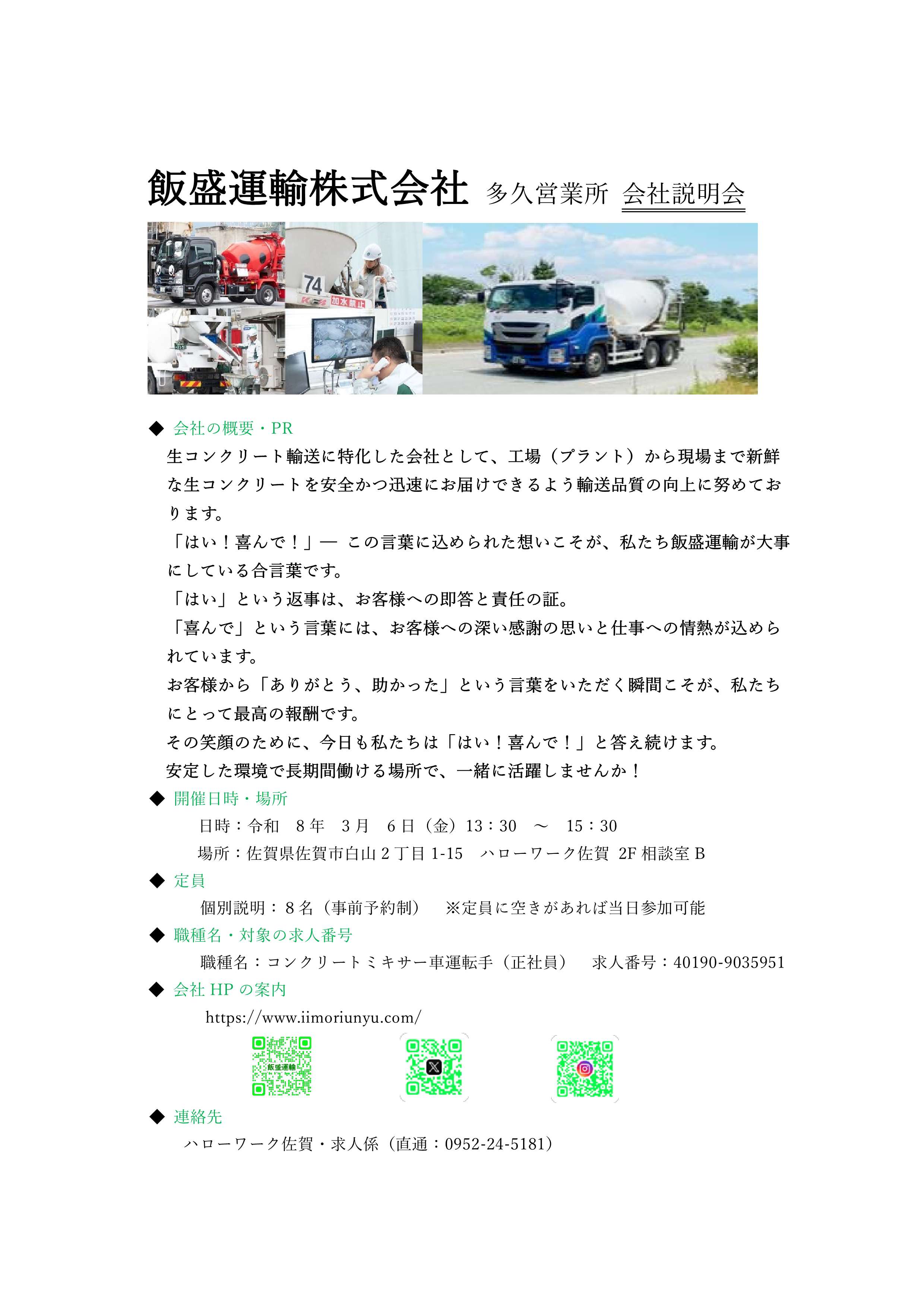 飯盛運輸株式会社 多久営業所における、個別会社説明会を開催します。