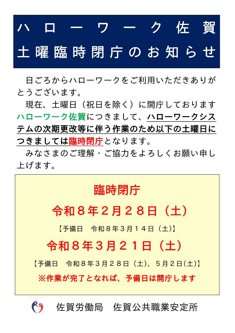 - ハローワーク佐賀 土曜臨時閉庁のお知らせ