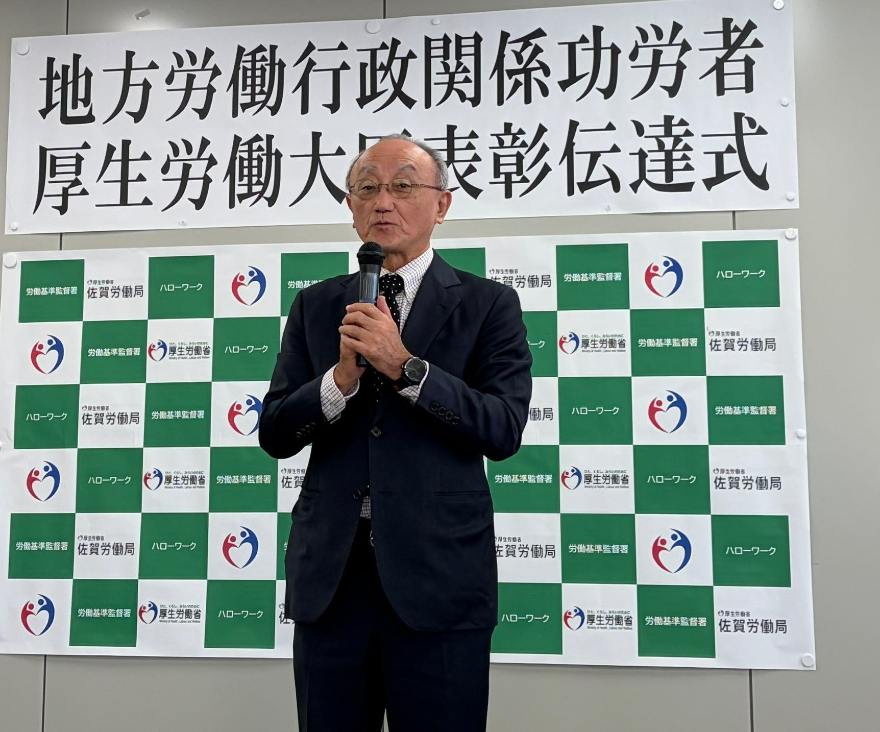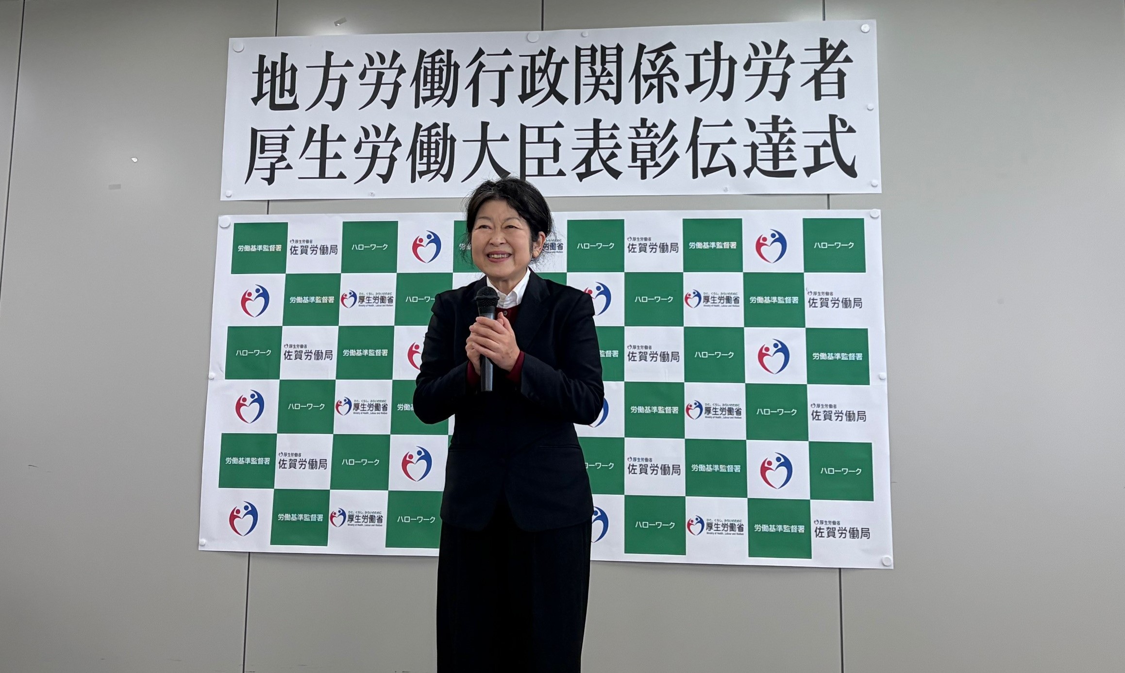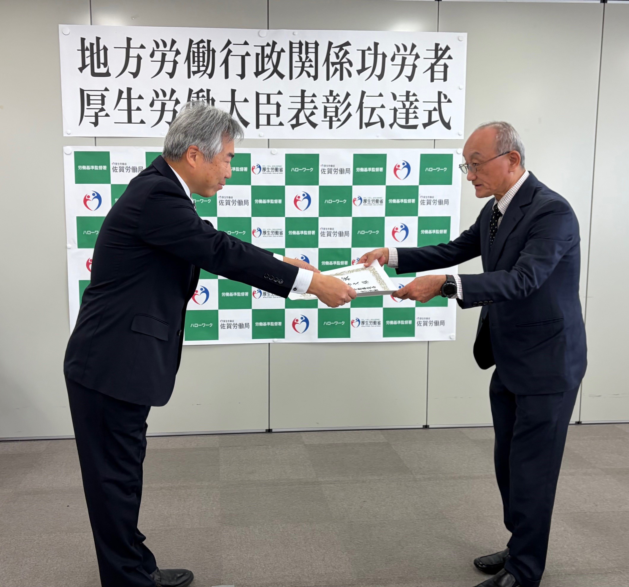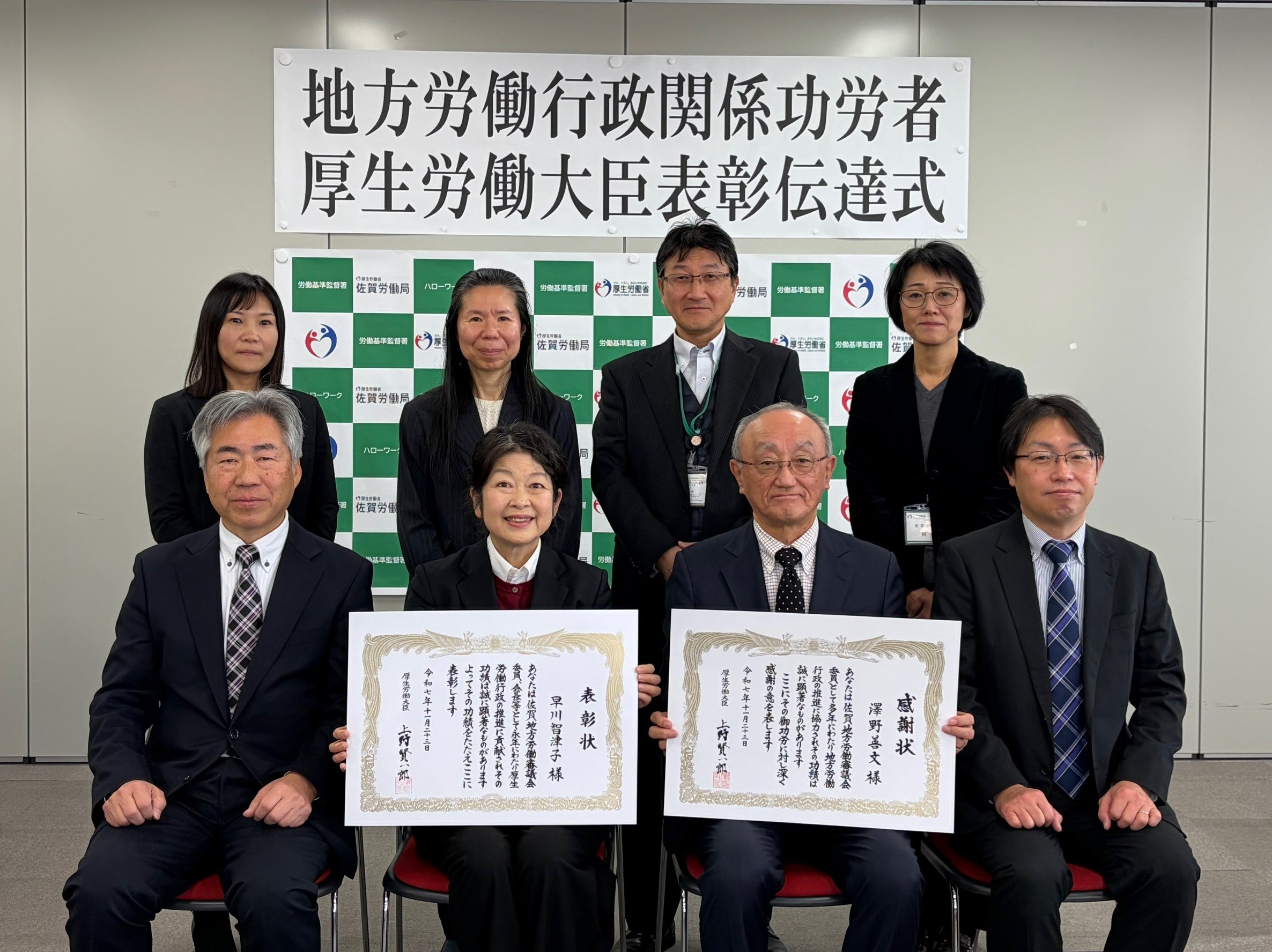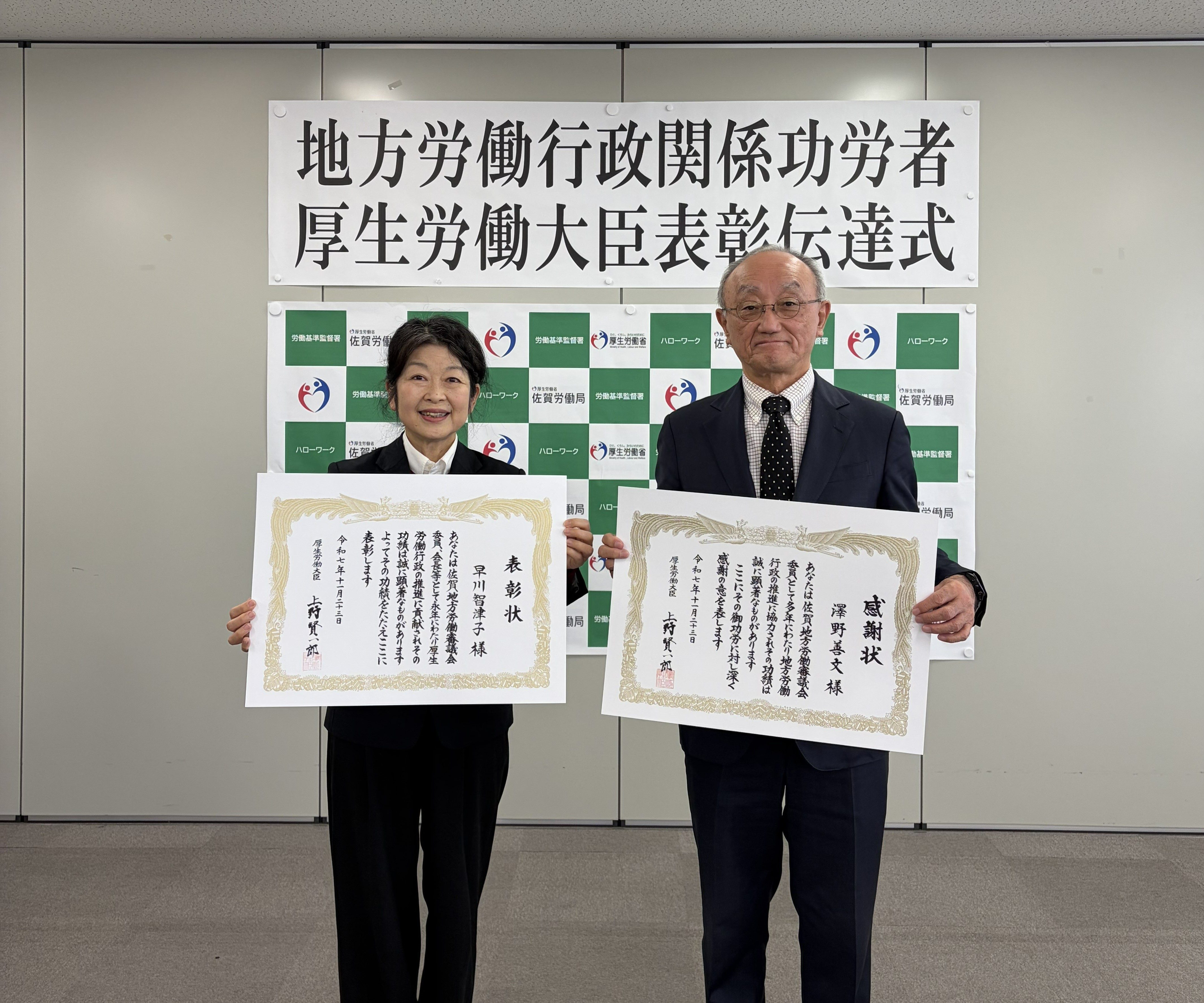 この度佐賀労働局では、佐賀地方労働審議会委員として10年間にわたり地方労働行政に係る施策の推進等にご尽力いただいた、早川 智津子氏(同審議会会長/国立大学法人佐賀大学 経済学部教授)へ厚生労働大臣表彰を、澤野 善文氏(同審議会公益代表委員/株式会社佐賀新聞社 常務取締役)へ厚生労働大臣感謝状をそれぞれ伝達しました。