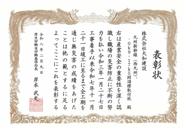 武雄労働基準監督署(署長:平山 正)において、株式会社大和建設(佐賀市)が管内で施工していた「九州新幹線(西九州)、-0k9・17k5間諸標取付他」工事について、無災害で工期を終えられたため、建設事業無災害表彰伝達式を開催し、同社に表彰状をお渡ししました。
