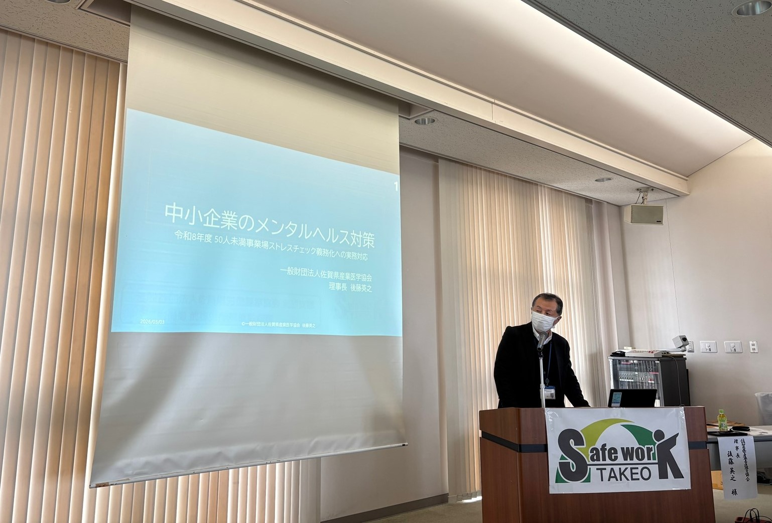 今回のセミナーでは、昨年5月の労働安全衛生法改正により常用労働者数50人未満の事業場においてもストレスチェックの実施が義務付けられたことを踏まえ(令和10年5月までに施行)、ストレスチェックを職場環境改善のためのツールとして活用していただきたく、一般財団法人佐賀県産業医学協会理事長の後藤英之様に「中小企業のメンタルヘルス対策」と題して、ご講演いただきました。