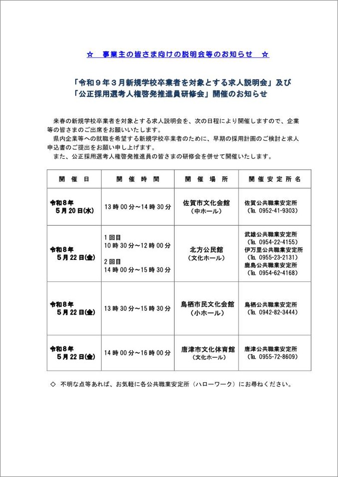 - 「令和9年3月新規学校卒業者を対象とする求人説明会」及び「公正採用選考人権啓発推進員研修会」開催のお知らせ
