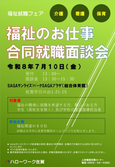 県内の福祉施設や病院、在宅介護サービス事業所等の介護・看護・保育職等を必要とする事業所の人事担当者が一堂に会し、面談会を行うとともに、福祉の資格並びに職種等に関する相談に応じることにより、福祉人材確保と、就業希望者の経験や条件等に対応した就業につなげるため、「福祉のお仕事合同就職面談会」を下記のとおり開催いたします。
