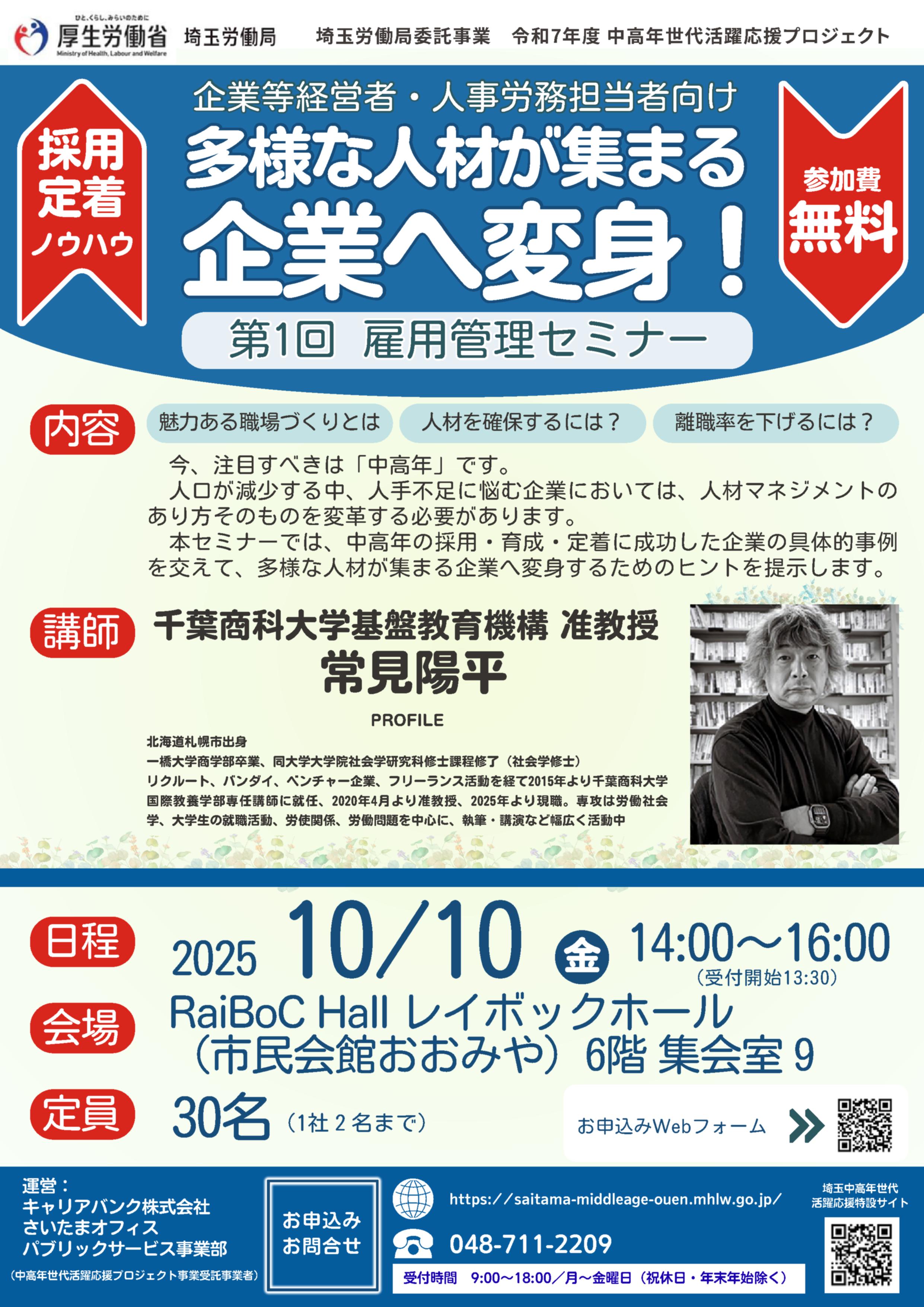 【埼玉労働局】10月10日(金)多様な人材が集まる企業へ変身!雇用管理セミナーのご案内