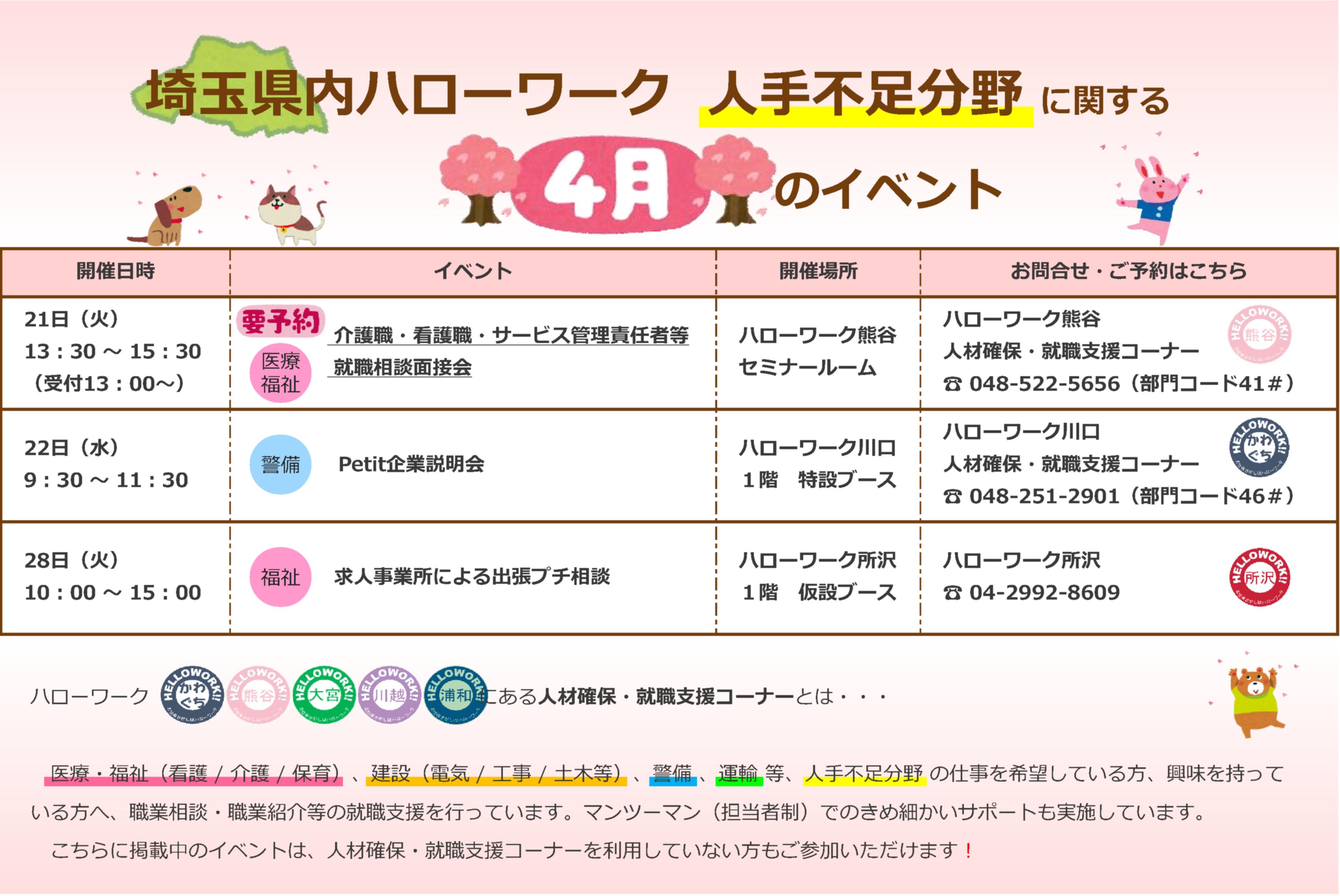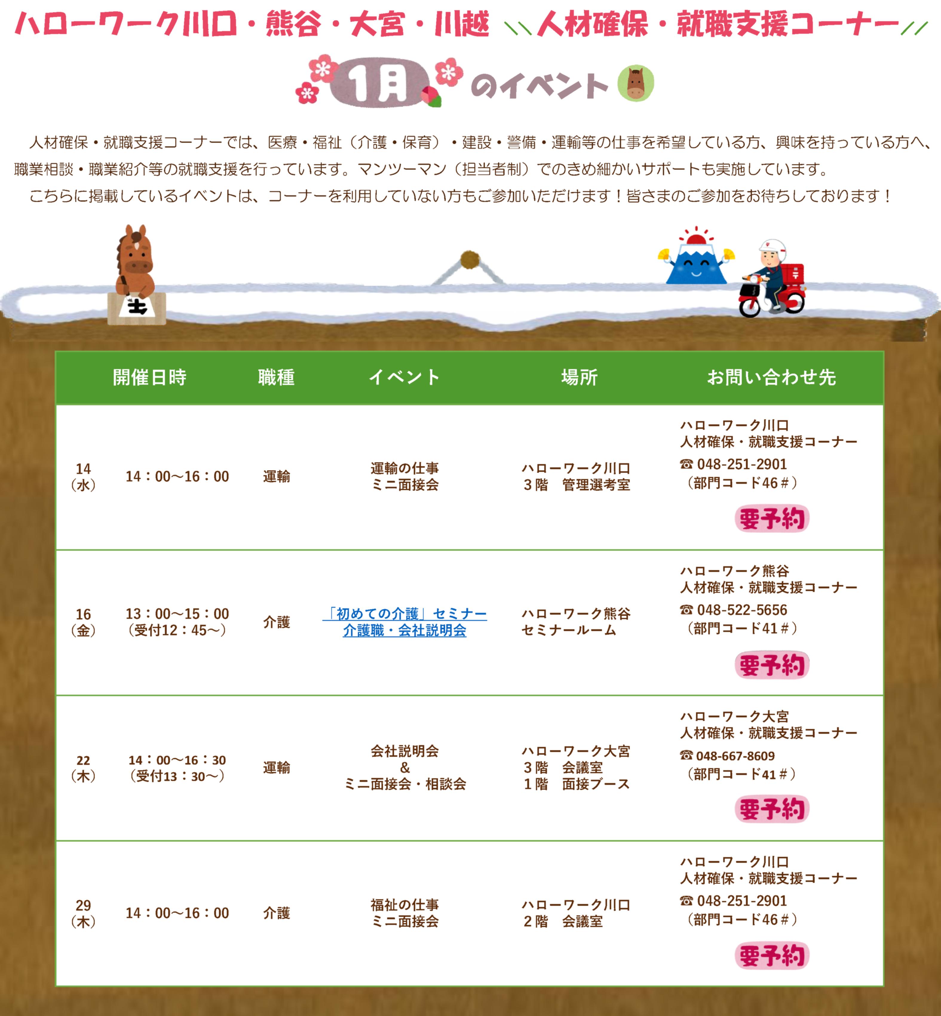 | ※ | 上記4か所以外のハローワークにおいても、「医療・福祉(介護・保育)・建設・警備・運輸分野」等の職種に関する支援、ミニ面接会や職場見学会等のイベントを実施しています。 下記の人材確保イベントカレンダー、もしくは、各ハローワークでご確認ください。 |