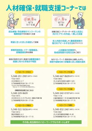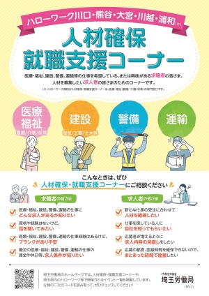 | 「医療・福祉(介護・保育)・建設・警備・運輸分野」等の職種について、求職者・求人者の両面から人材確保支援を行う総合窓口として、一体的なサービスを実施しています。 埼玉県内では、人材確保・就職支援コーナーをハローワーク川口・熊谷・大宮・川越・浦和(※1)の5か所に設置しています。 |