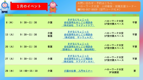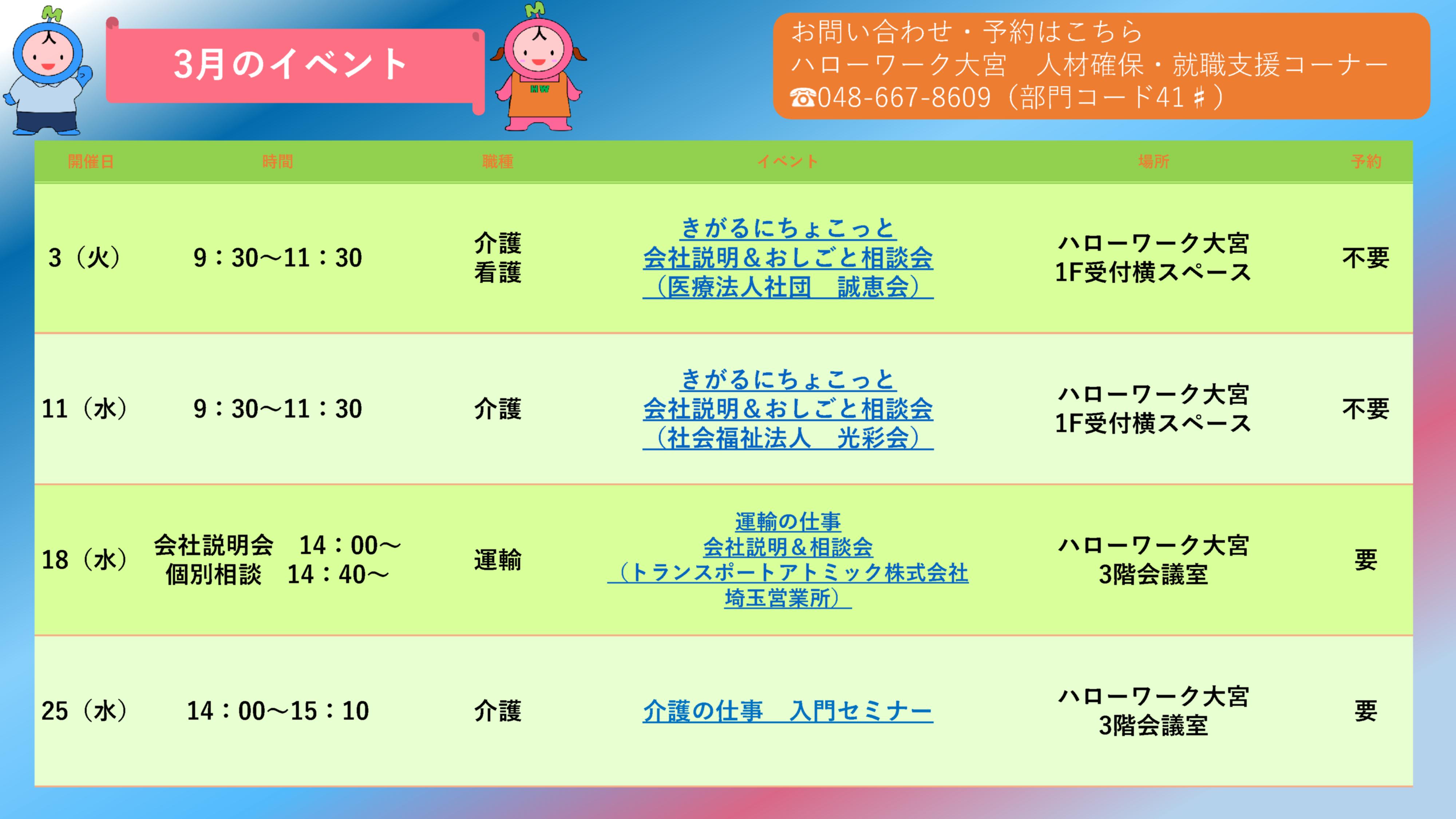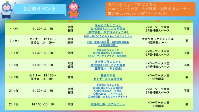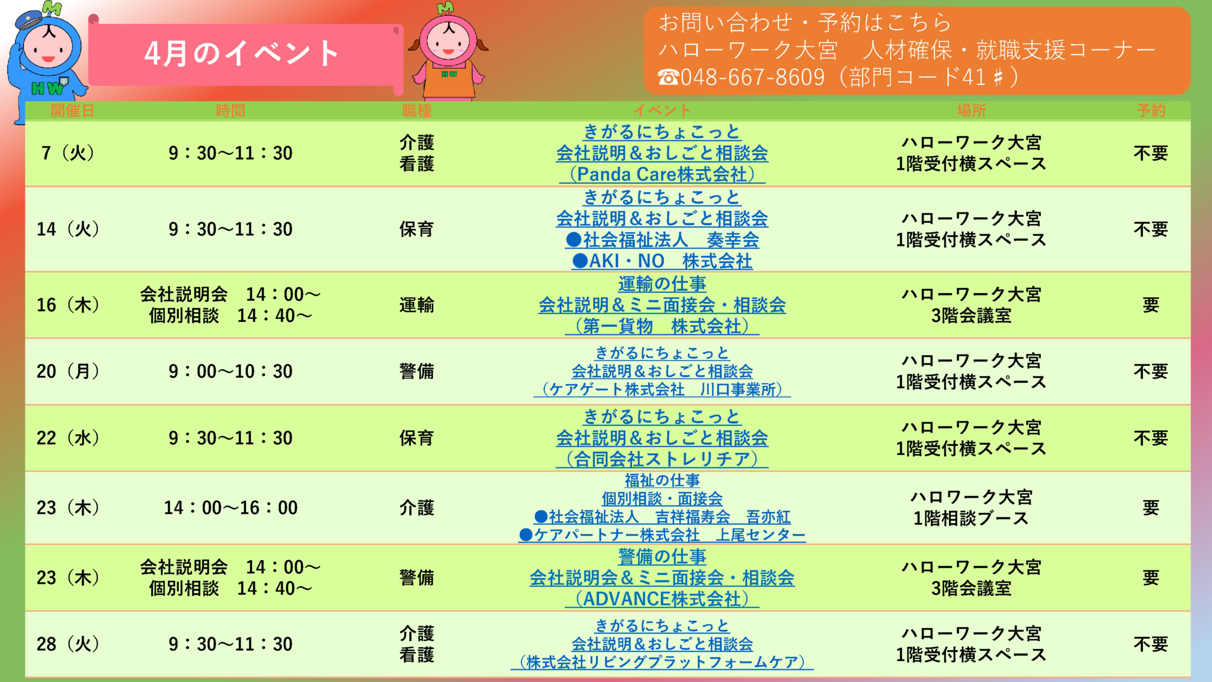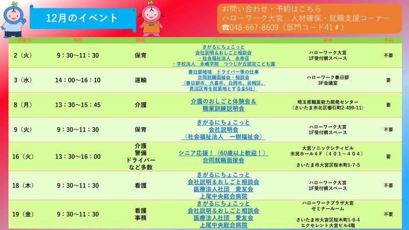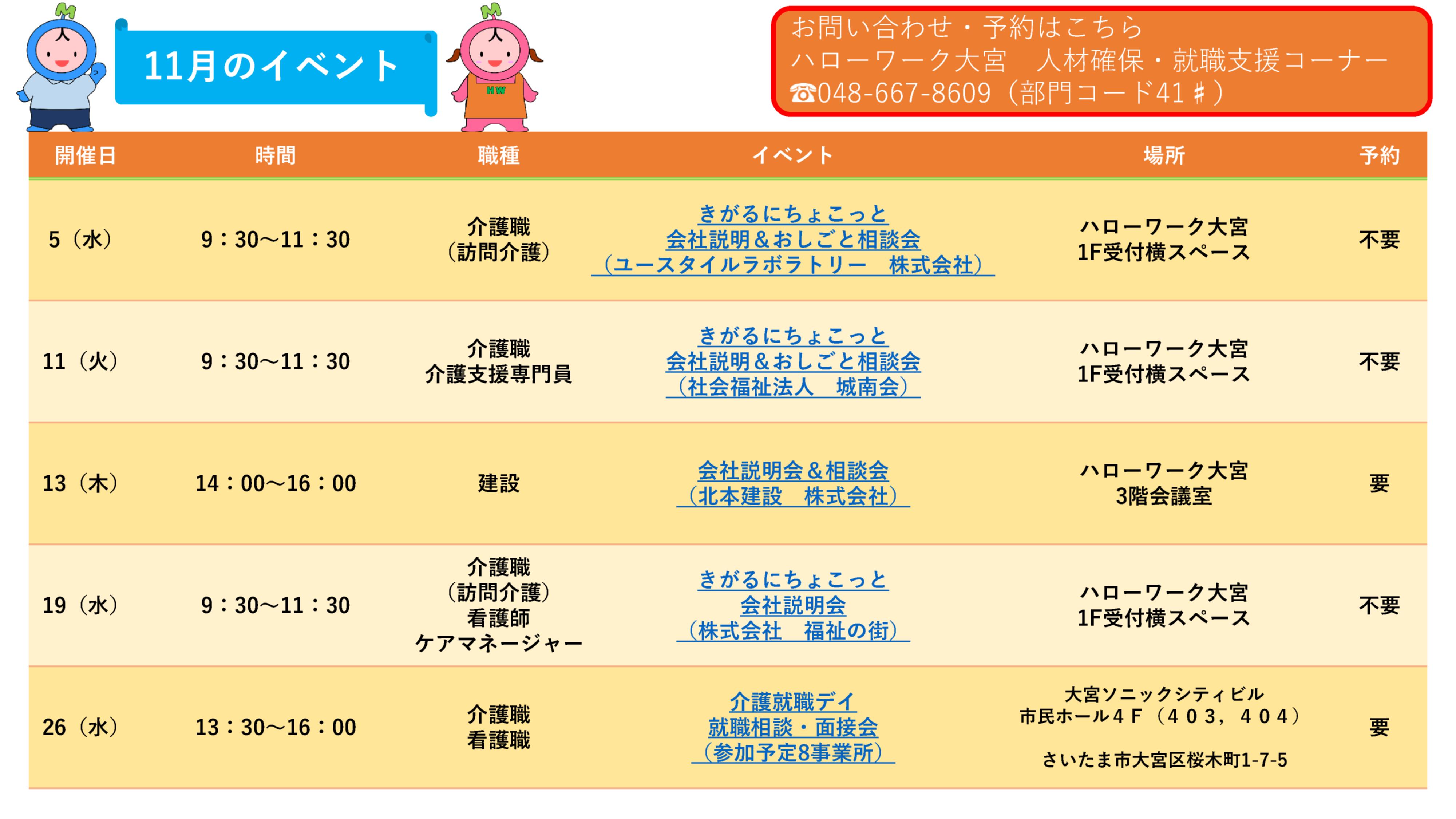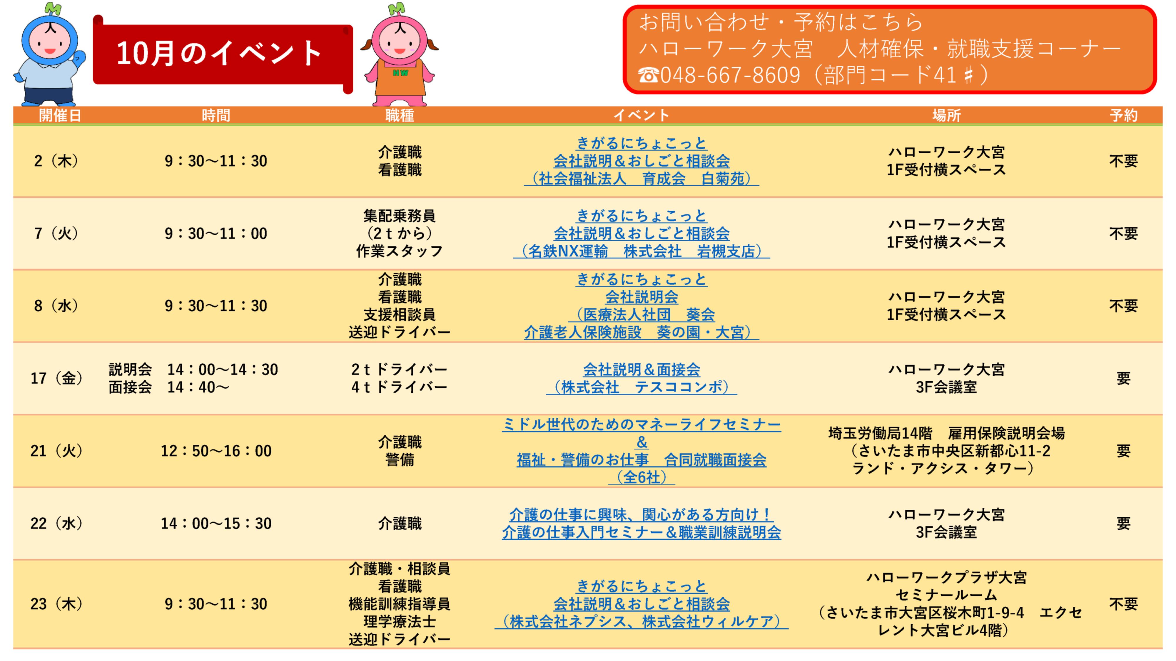入社してみたけど思っていた内容と違う……そんな不安を取り除くため、ハローワーク大宮では事業所の担当者に直接話が聞ける会社説明会や面接会、ハローワーク職員と一緒に就業場所を見学できるツアー面接会など様々なイベントを実施しています!