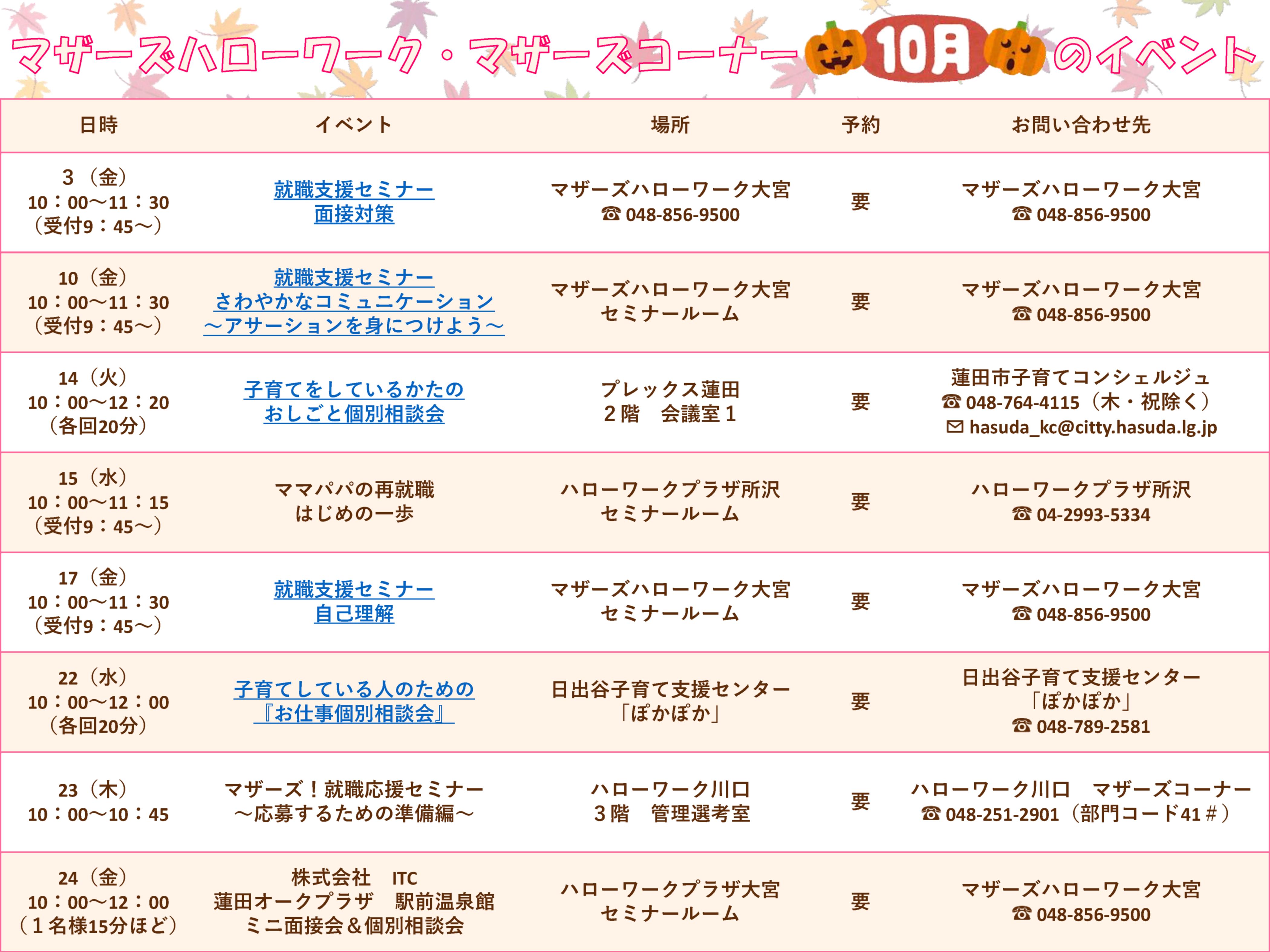 マザーズハローワーク・マザーズコーナー イベントカレンダー(10月) ↓ ↓ ↓ |