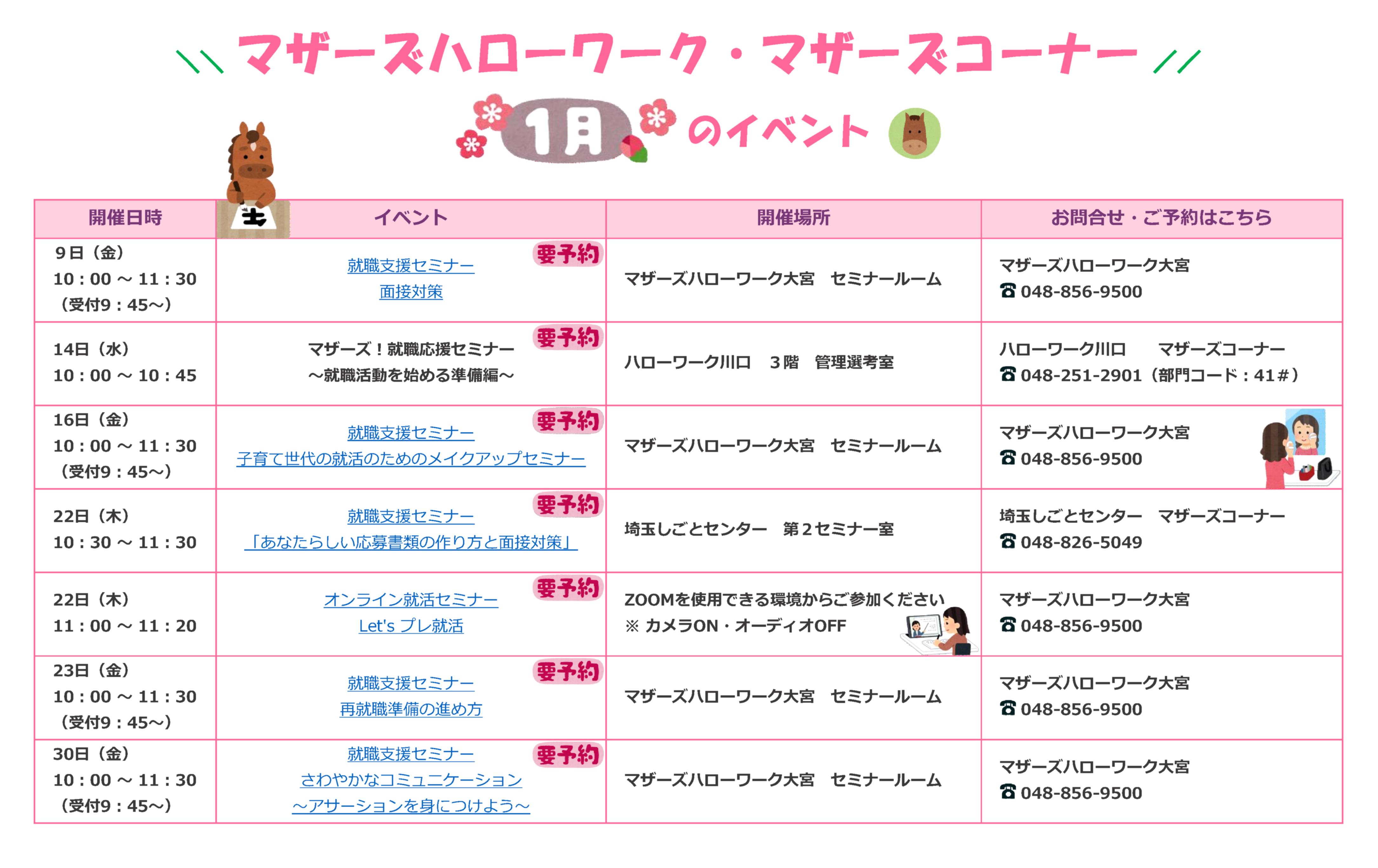 | マザーズハローワーク・マザーズコーナー イベントカレンダー(1月) ↓ ↓ ↓ |
