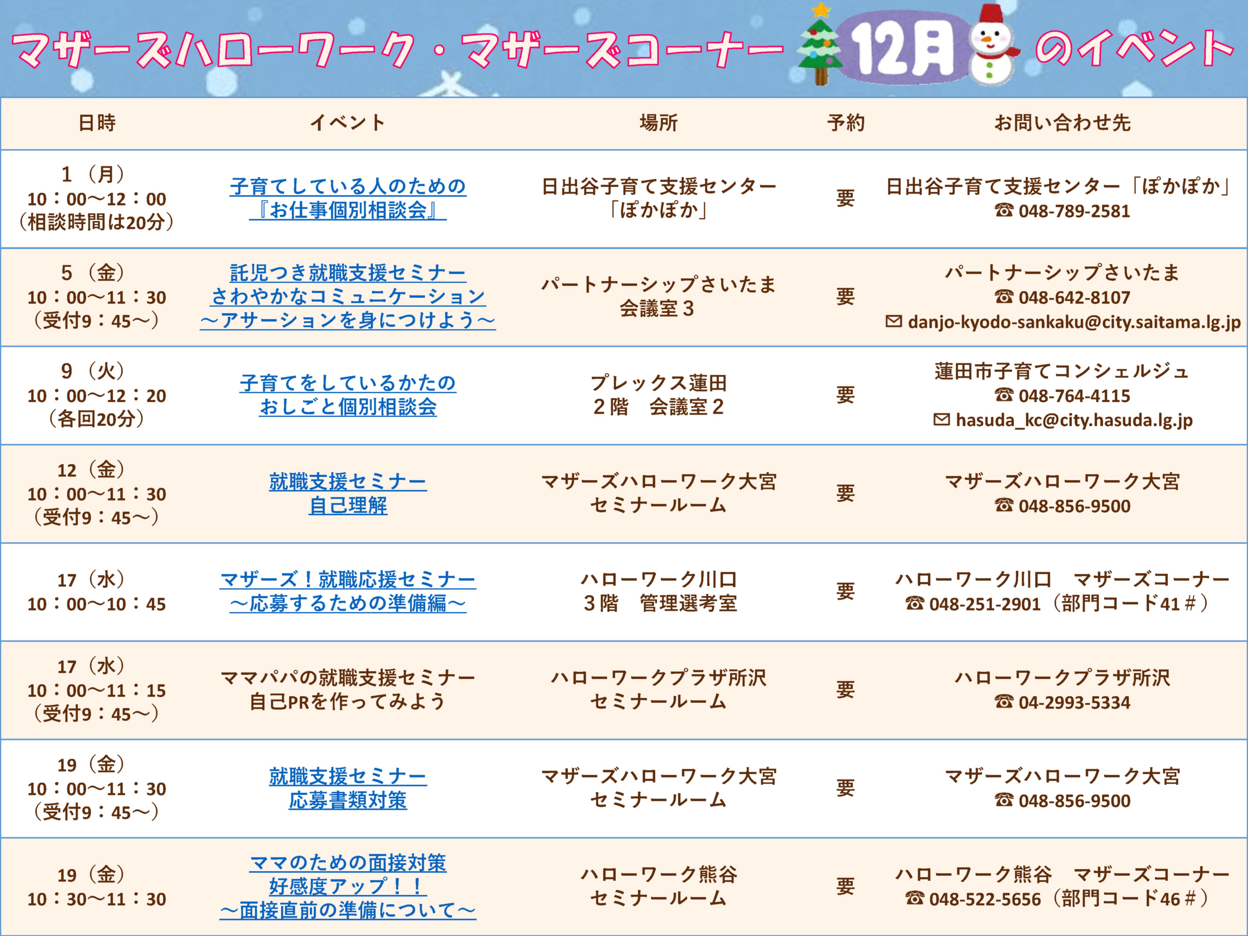 | マザーズハローワーク・マザーズコーナー イベントカレンダー(12月) ↓ ↓ ↓ |