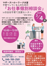 | 【日時】 | 3月4日(水) 10:00~12:00(各回20分) 10:00~/10:30~/11:00~/11:30~ ※申込開始:2月18日(水) 9:30~ ※次回の相談日は4月6日(月)を予定しています。 |