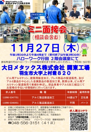 5. 【行田】11/27「ミニ面接会」のお知らせ 大日メタックス(株) 関東工場 ・ (株)サンケー技工