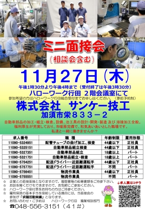 【行田】11/27「ミニ面接会」のお知らせ 大日メタックス(株) 関東工場 ・ (株)サンケー技工
