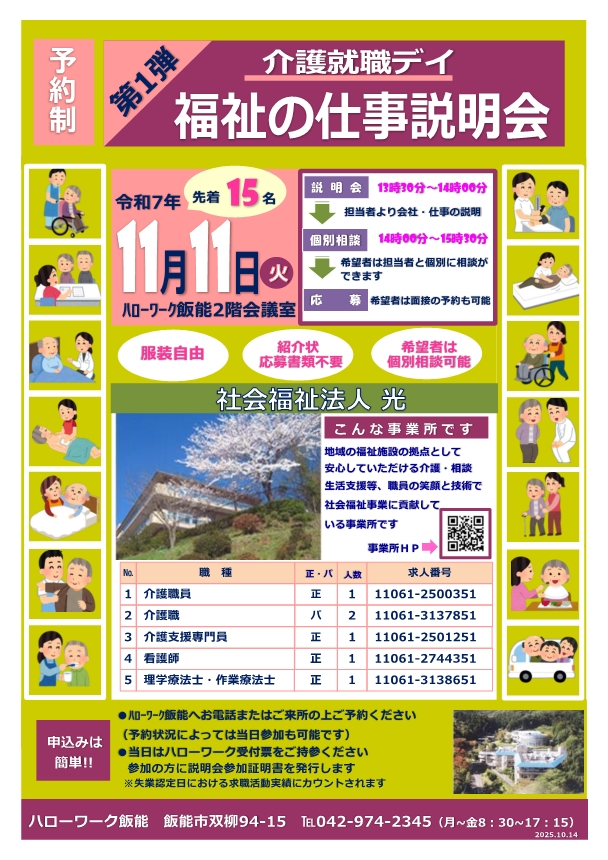 【飯能】11月11日(火)「介護就職デイ福祉の仕事説明会①」を開催します!【説明会】
