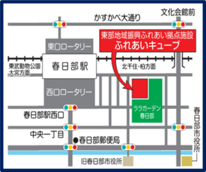 | 開催場所 | 春日部地域振興ふれあい拠点施設 お越しの際は、公共交通機関をご利用ください。 ![]() ふれあいキューブ 1階多目的ホールB・C 春日部市南1-1-7 春日部駅(西口)より徒歩5分 |