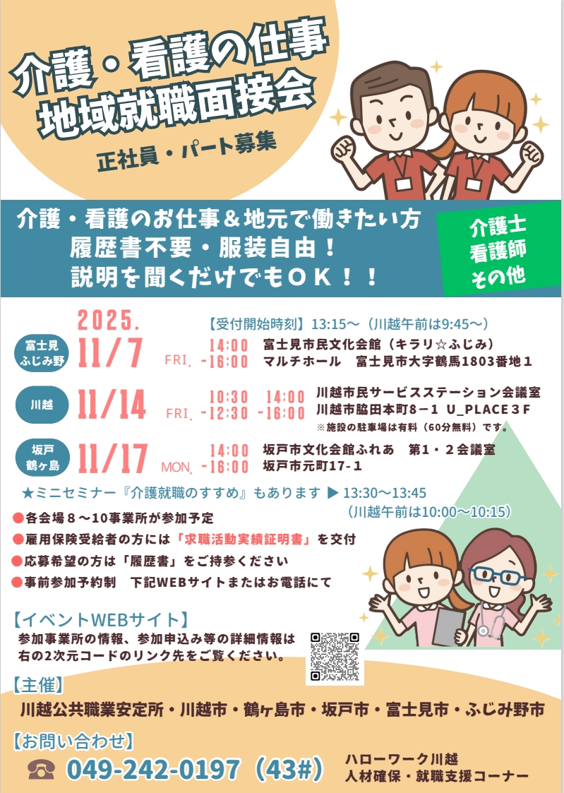 ※ | 福祉(介護、医療、保育)、建設、警備、運輸の人材を必要とする事業主の方は、事前に人材確保・就職支援コーナー(TEL049-242-0197 43#)へ、ご相談ください。 |